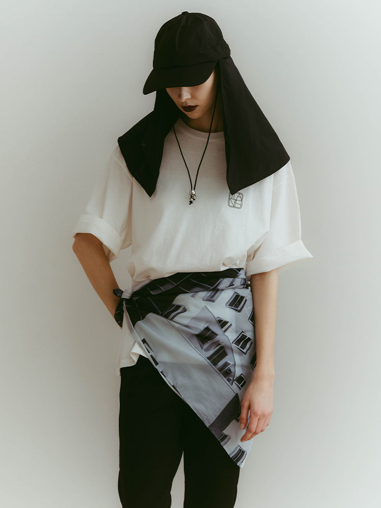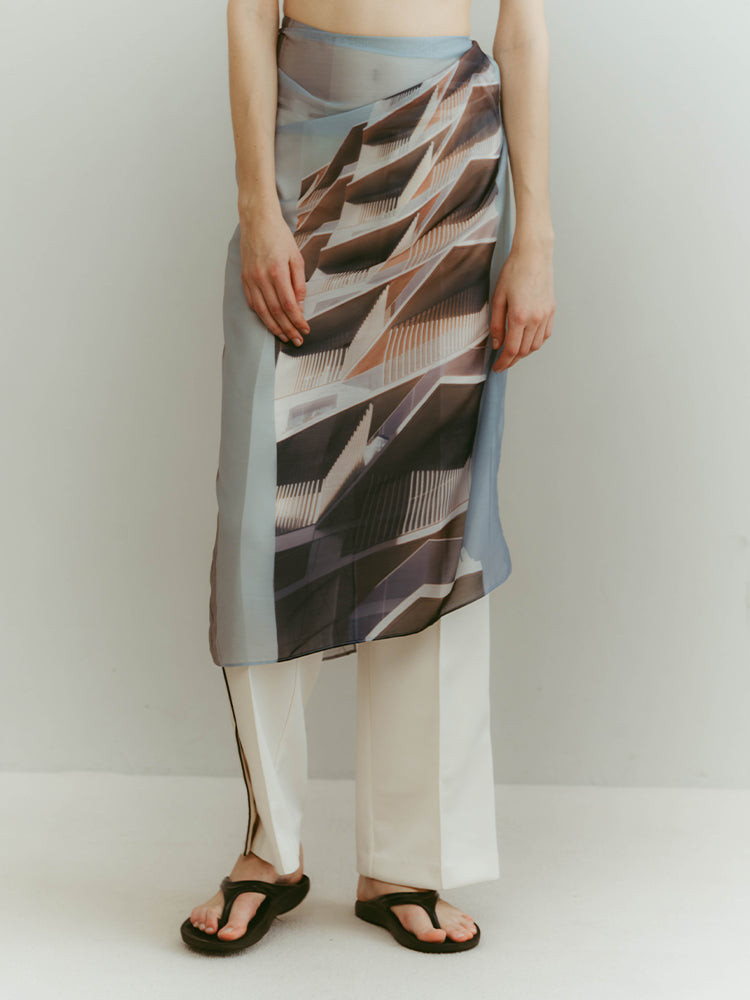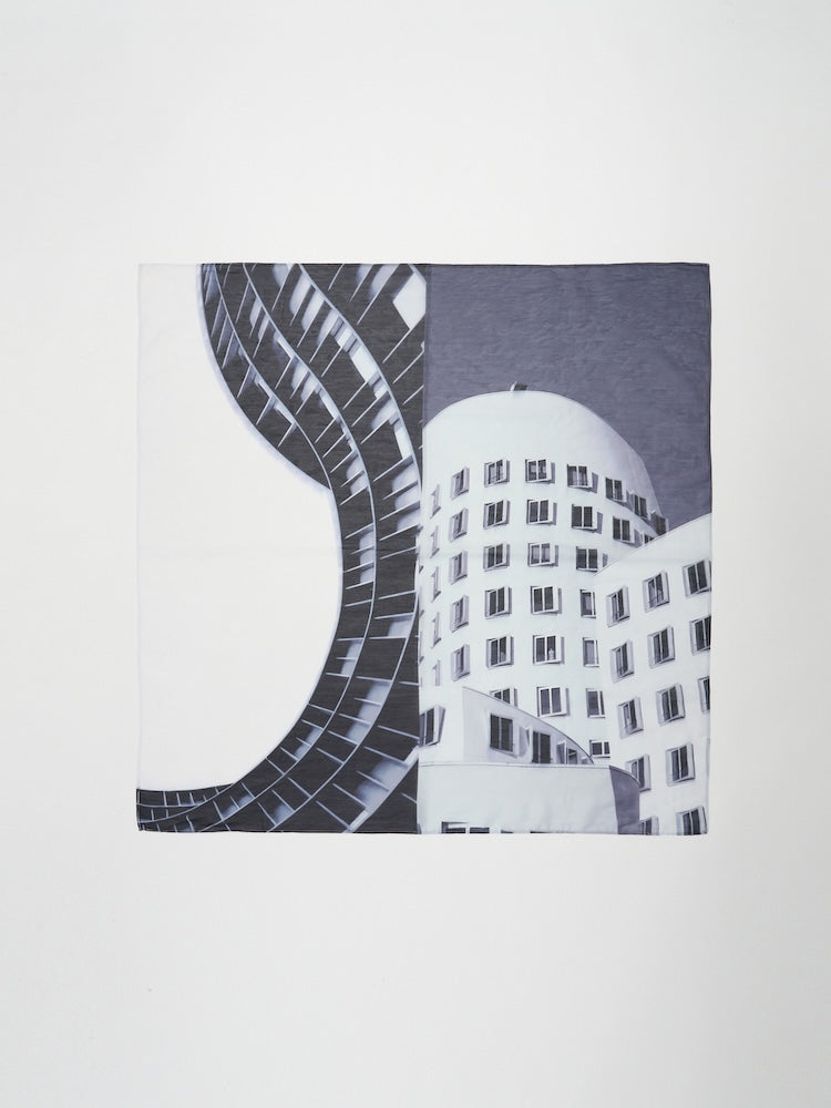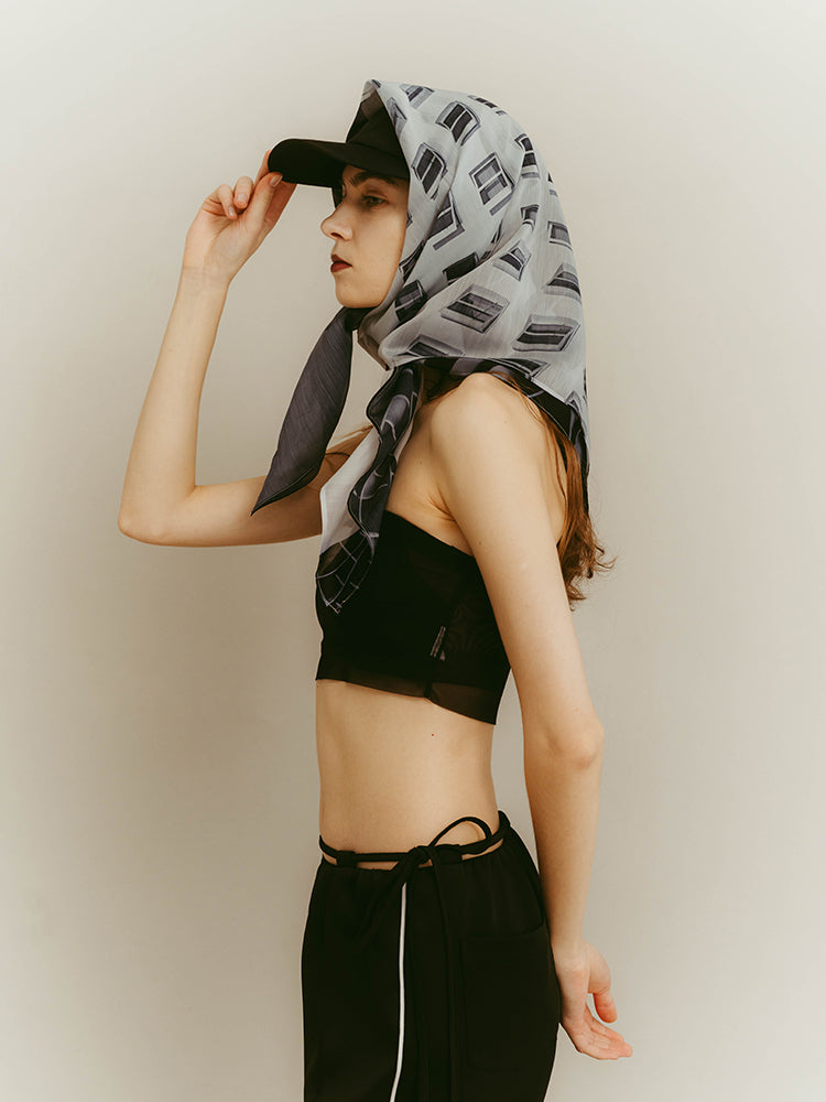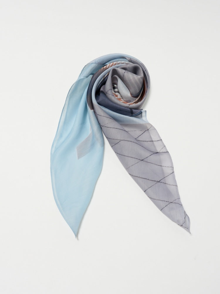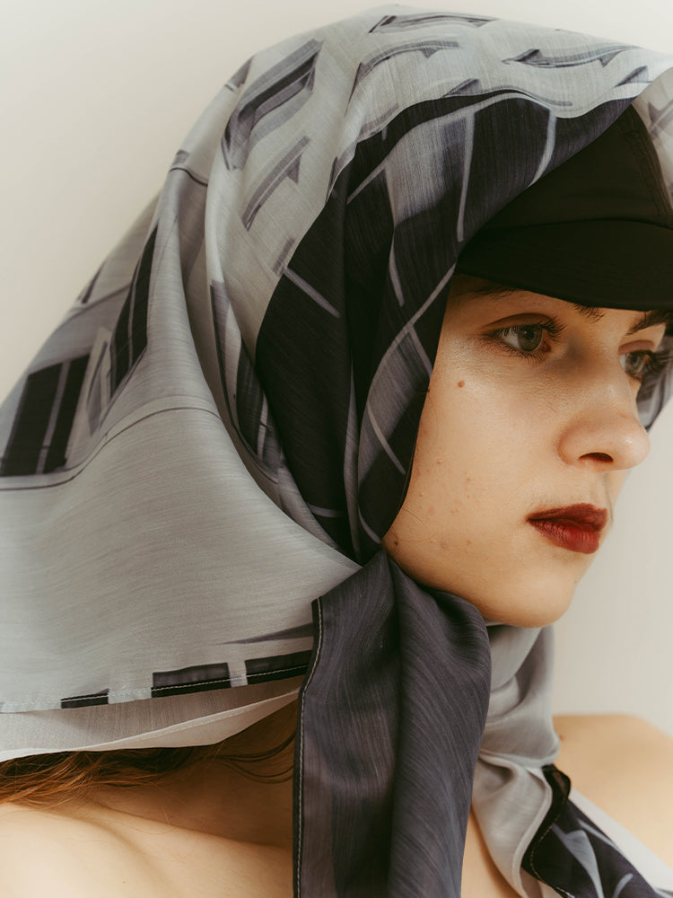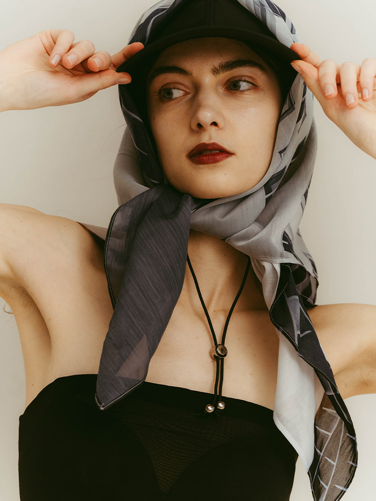 構築的なグラフィックを、軽やかに纏うシアースカーフ。