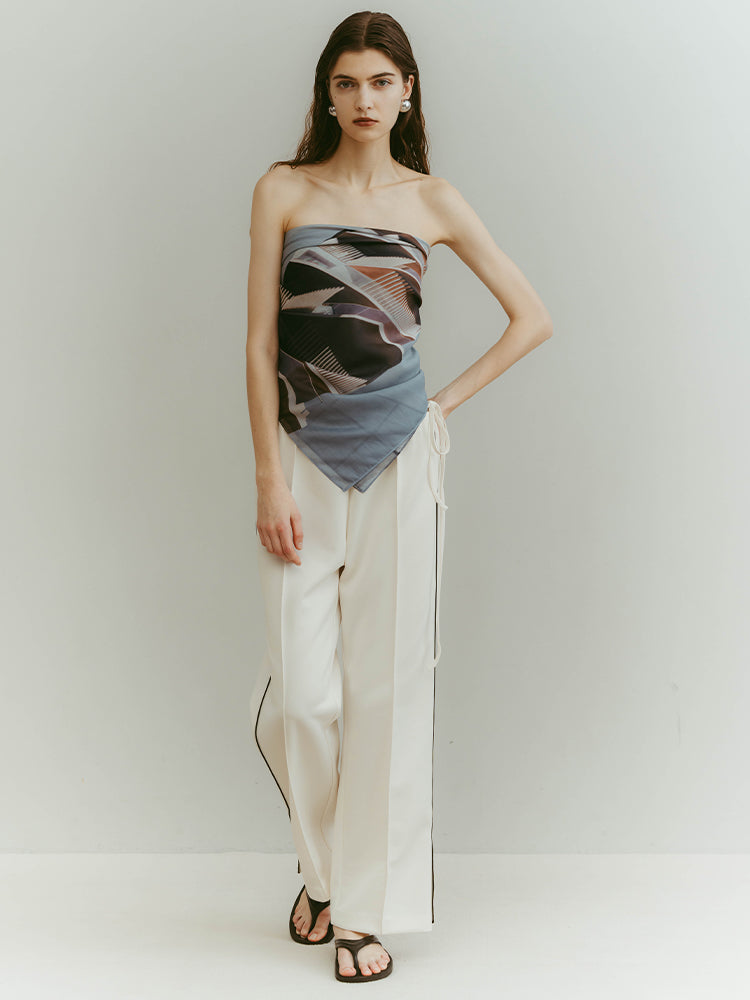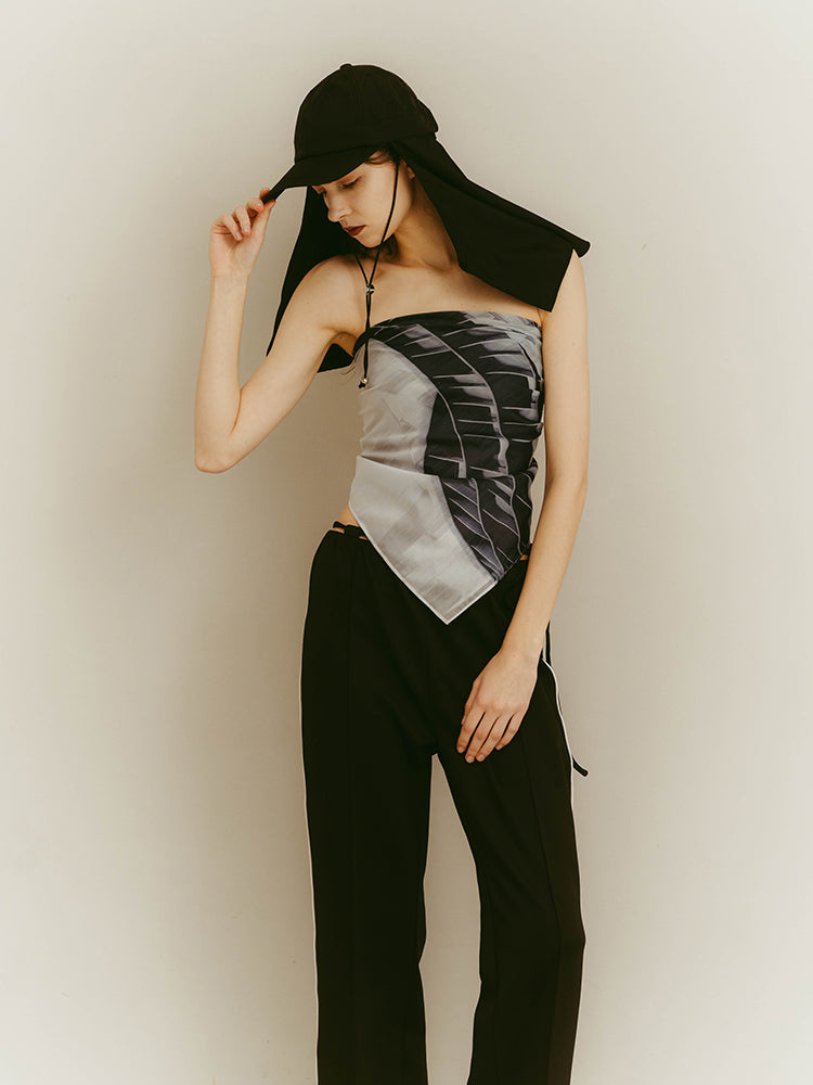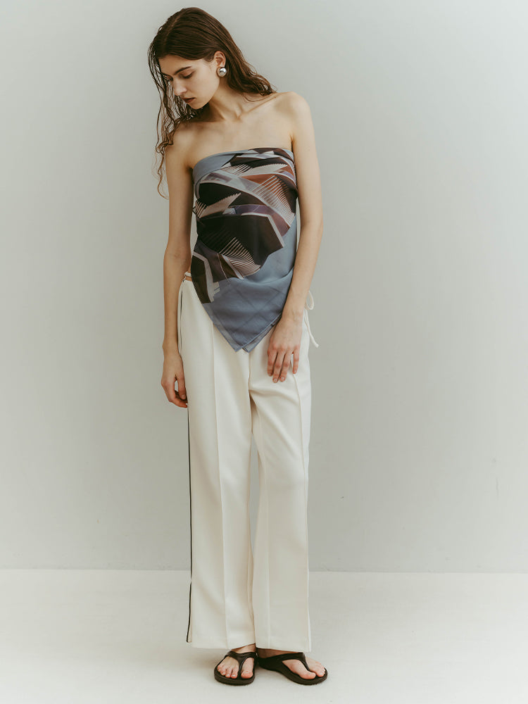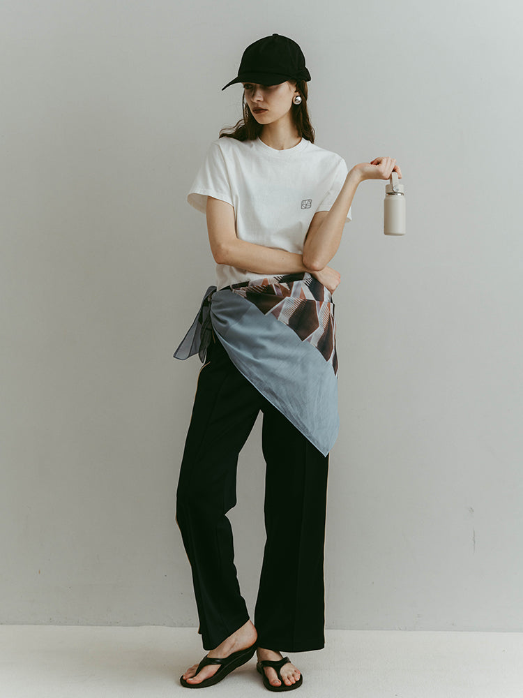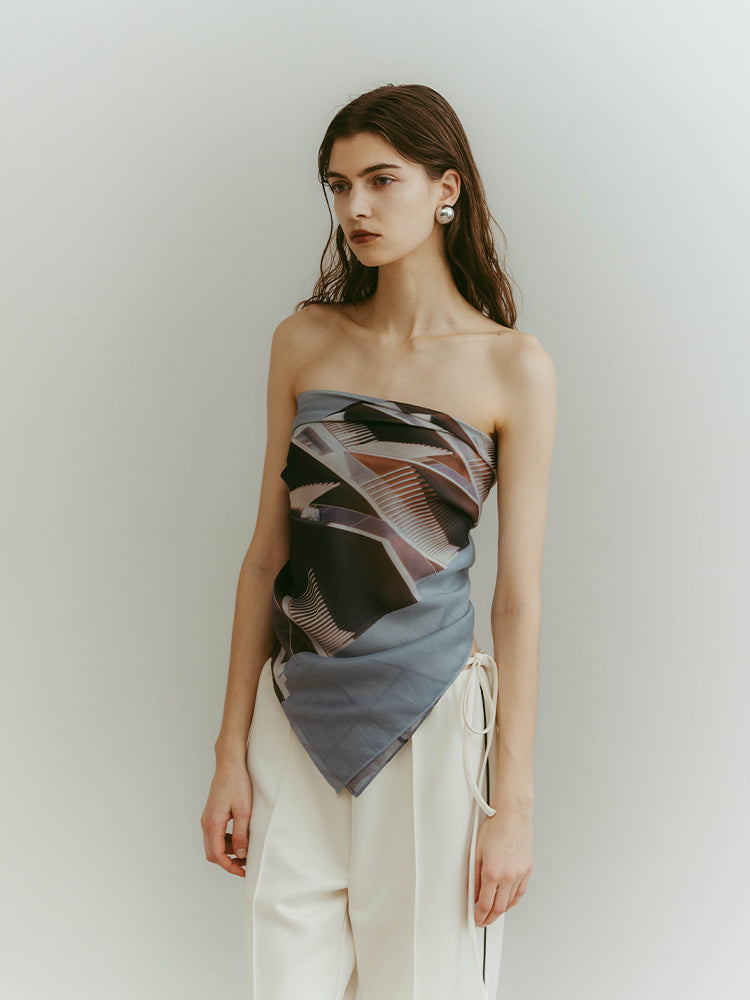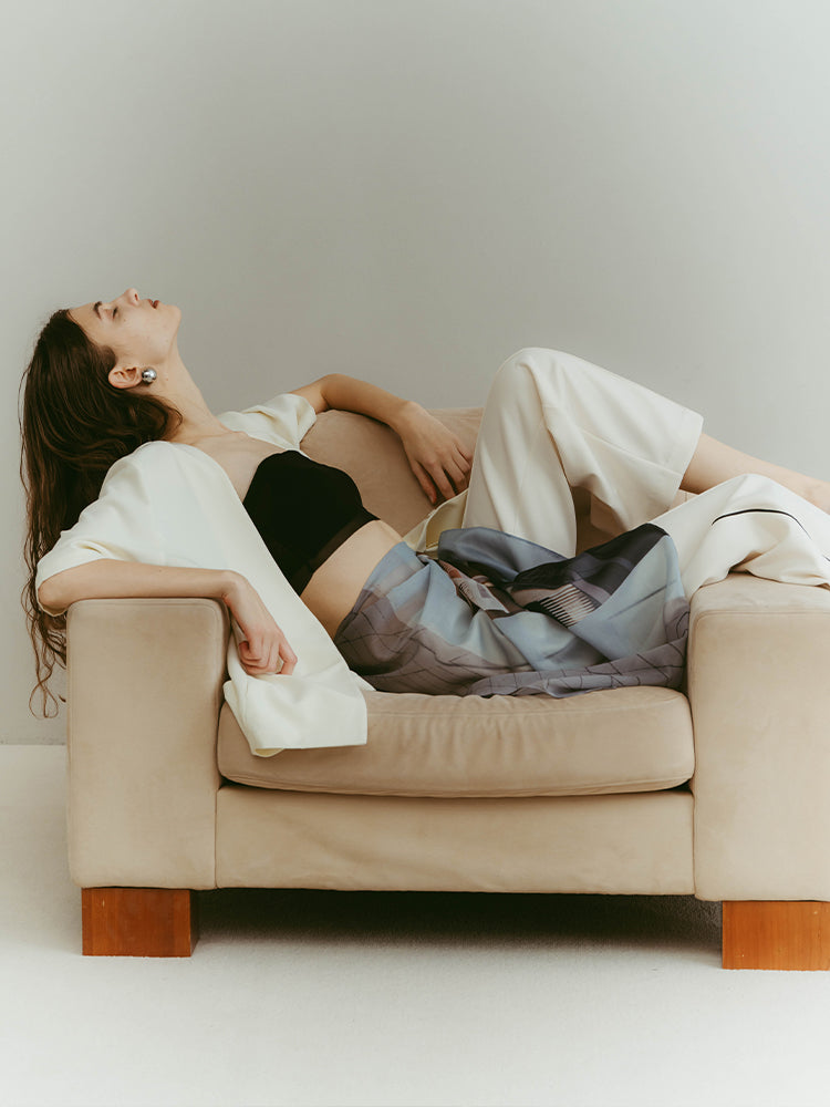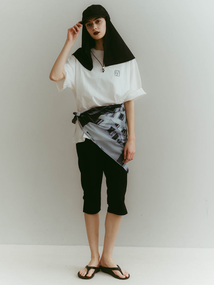構築的なグラフィックを、軽やかに纏うシアースカーフ。