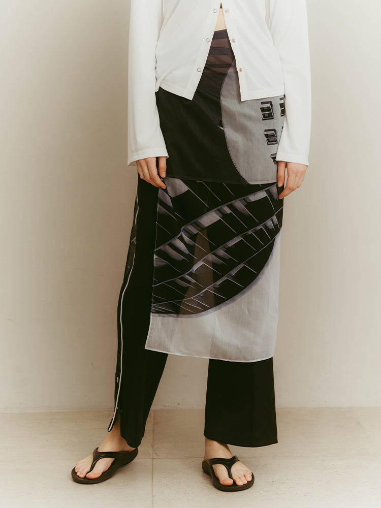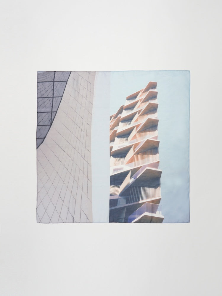建築物の曲線や直線から着想を得たコラージュデザインを、透け感のある素材と余白を活かした構成に落とし込みました。