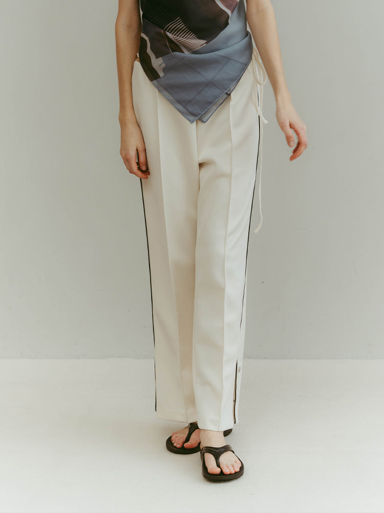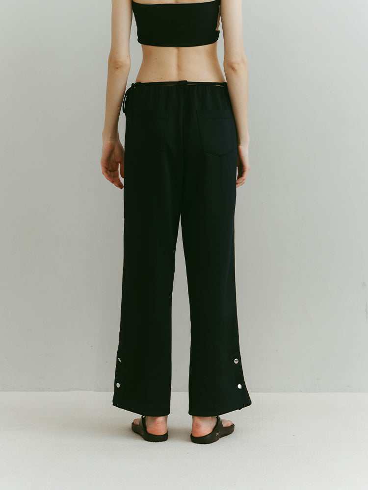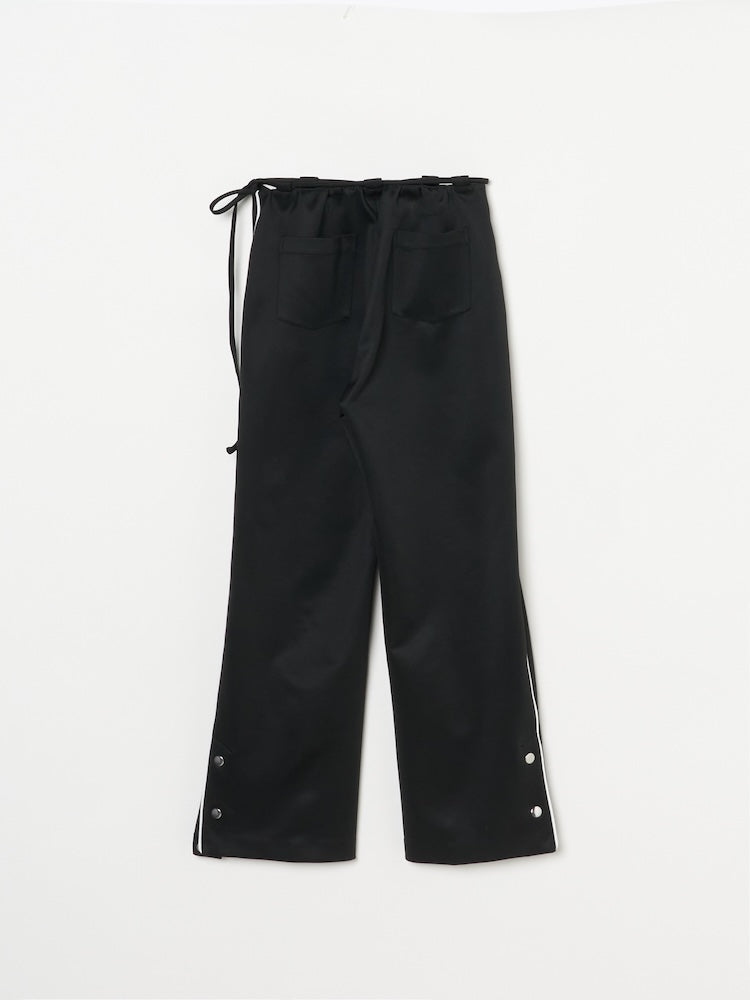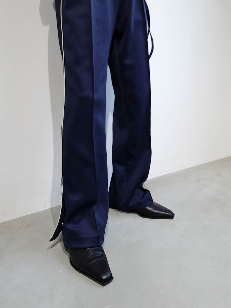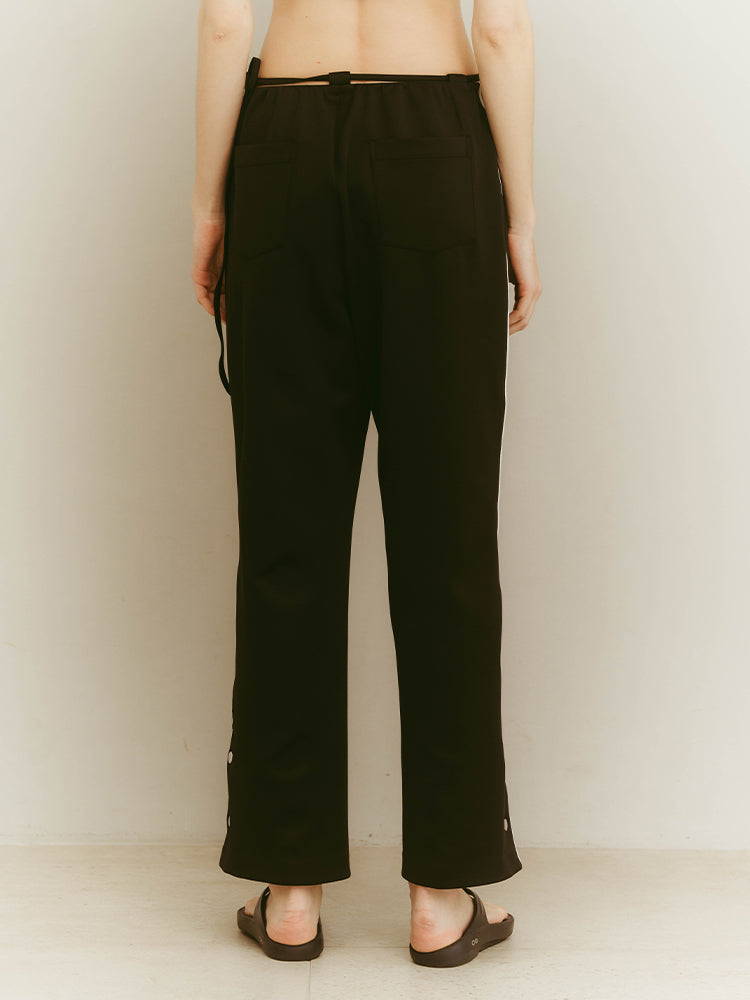 ジャージならではのゆったりとした履き心地。サイドラインや裾のボタンなど、細部にまでこだわっている一着です。スニーカーやフラットシューズを履いても床をずってしまうこともなさそうです!