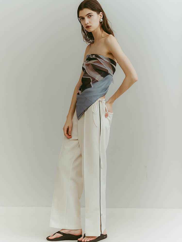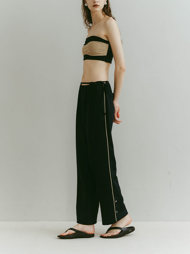 華奢な紐がアクセントとなり、リラックス感の中にも上品な表情を添えています。サイドの細いラインが縦のラインを強調し、自然なスタイルアップを叶えます。