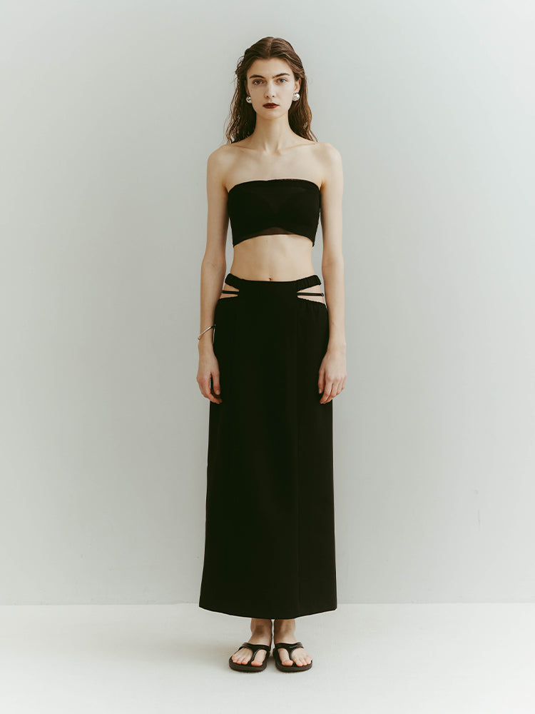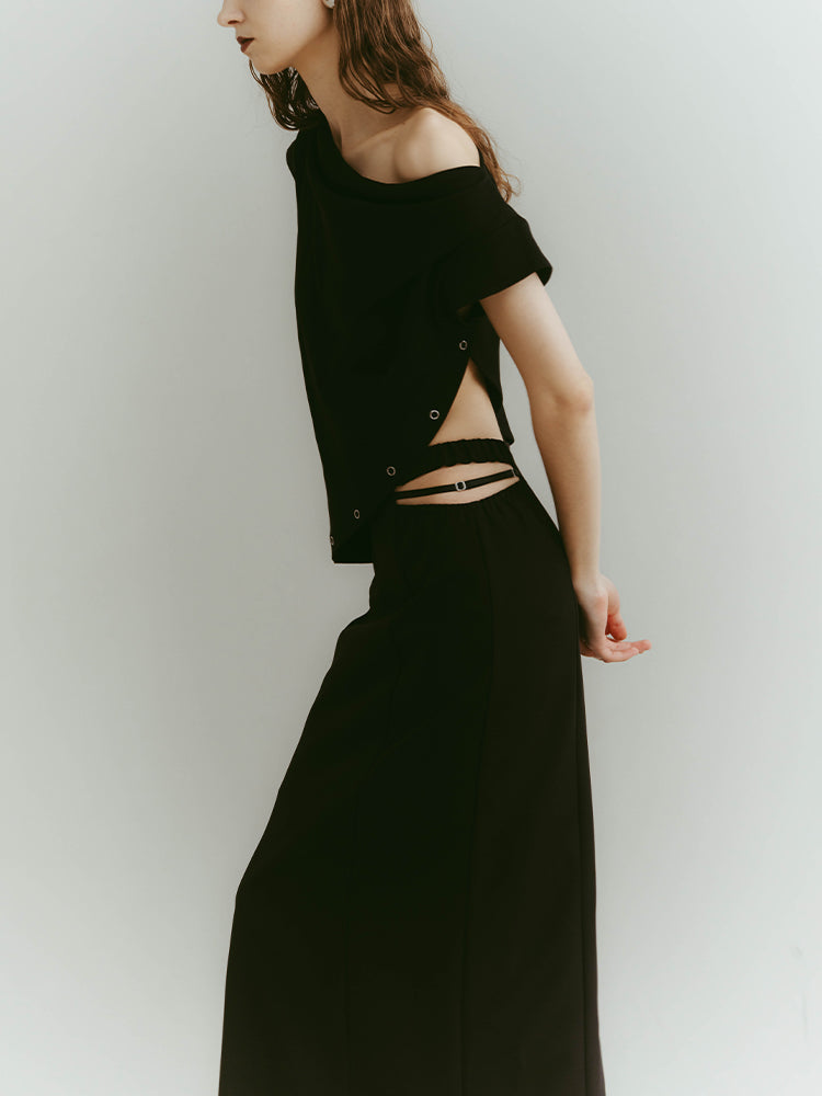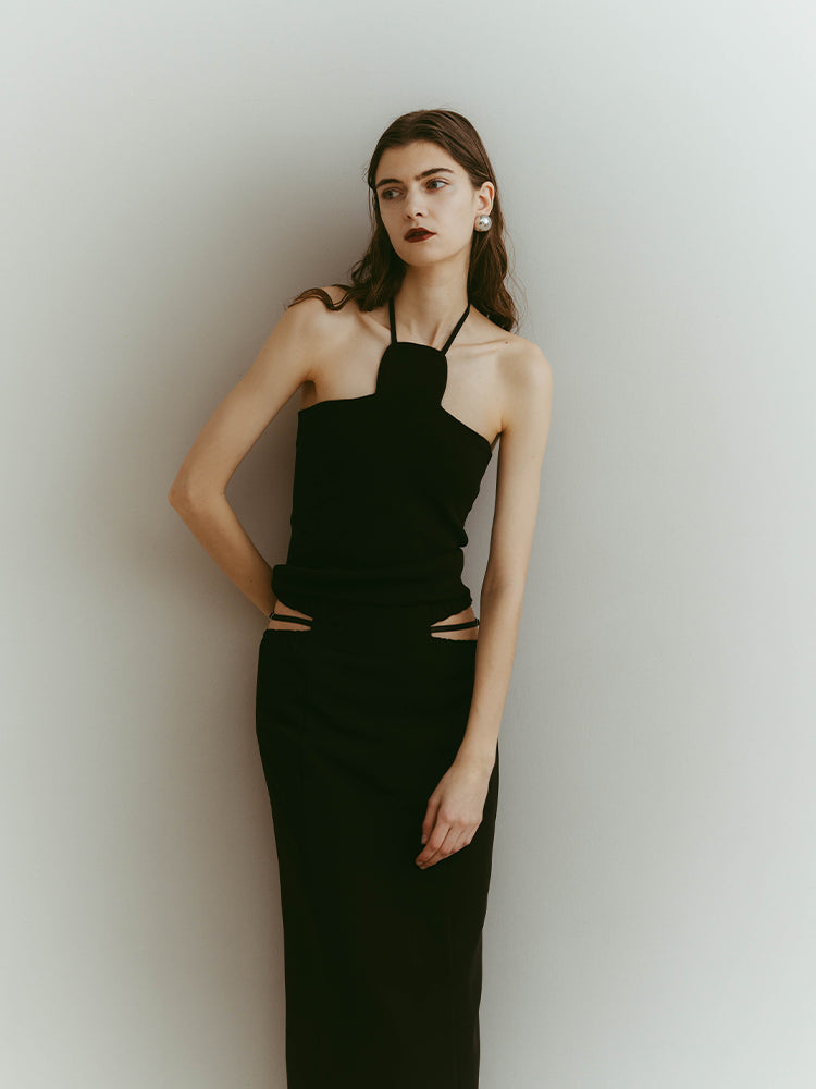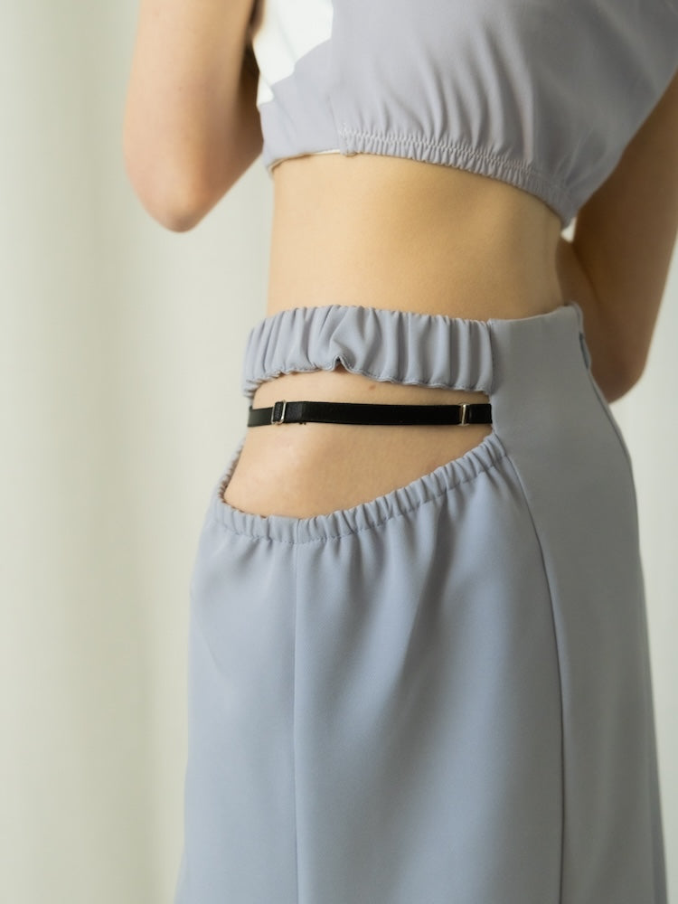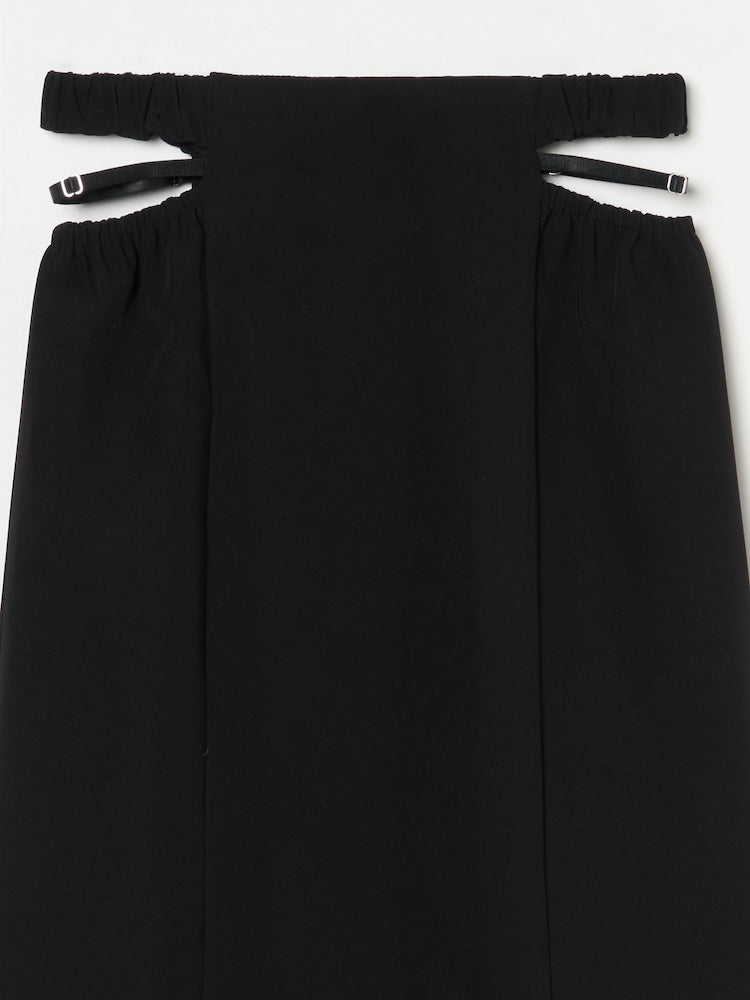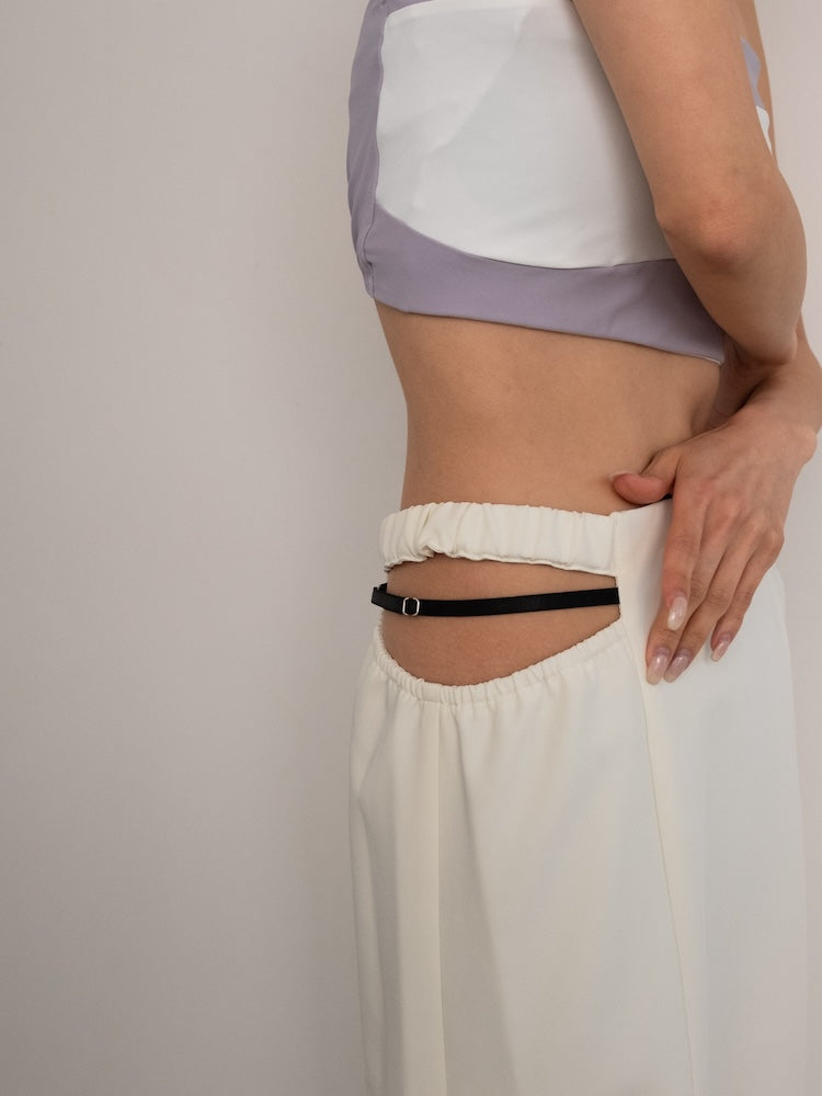 ウエスト左右のシャープなカッティングと、中心を走るブラックベルトが、構築的でありながらエレガントな佇まいを演出します。