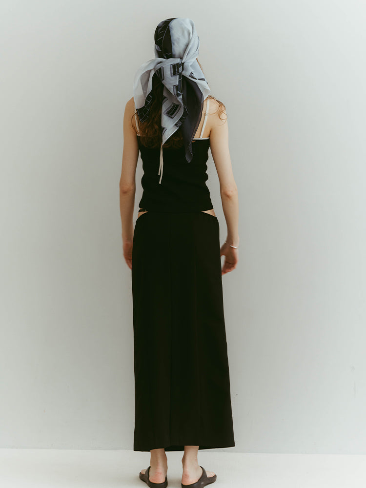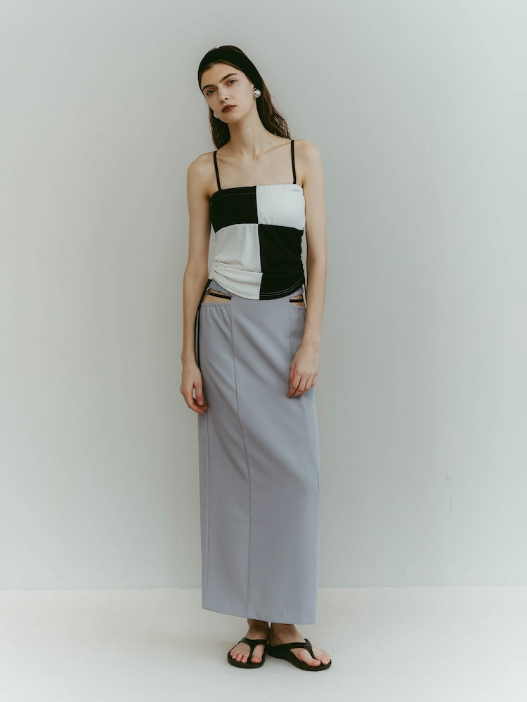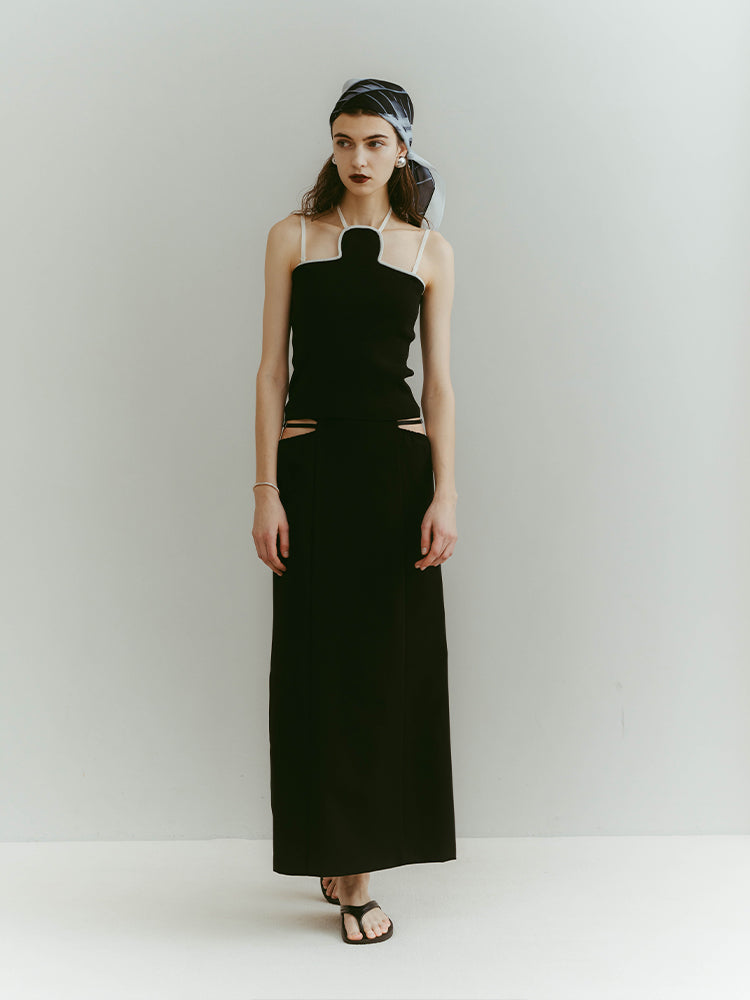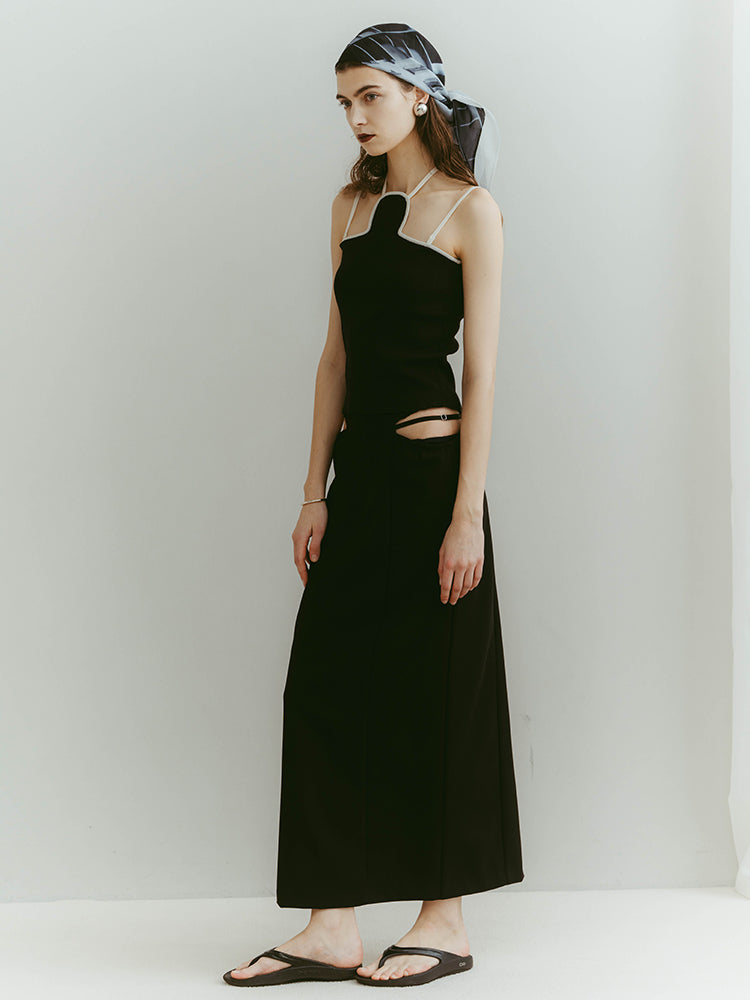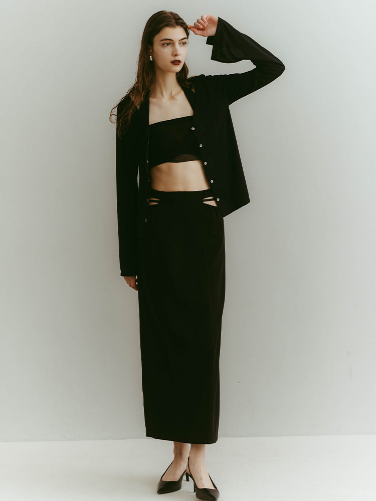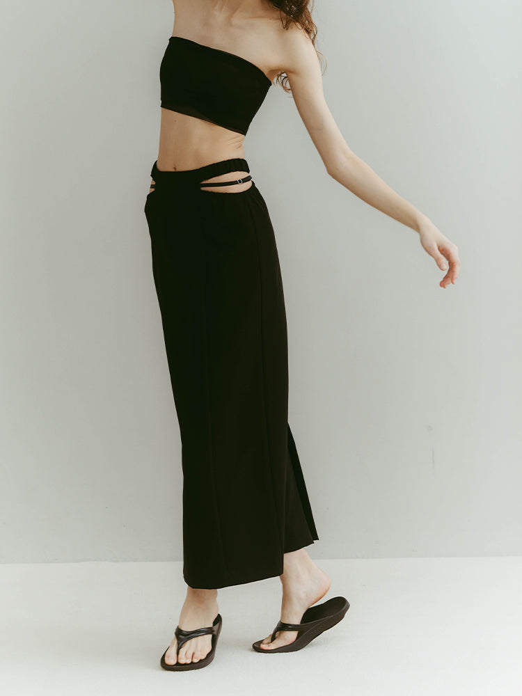 ウエスト左右のシャープなカッティングと、中心を走るブラックベルトが、構築的でありながらエレガントな佇まいを演出します。