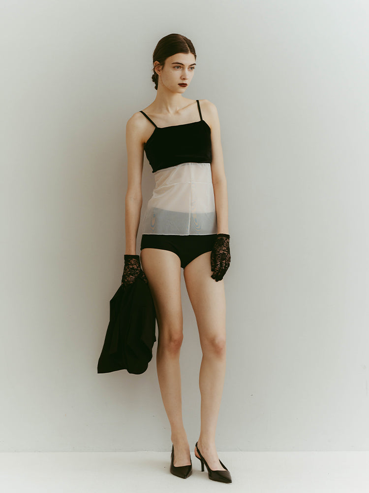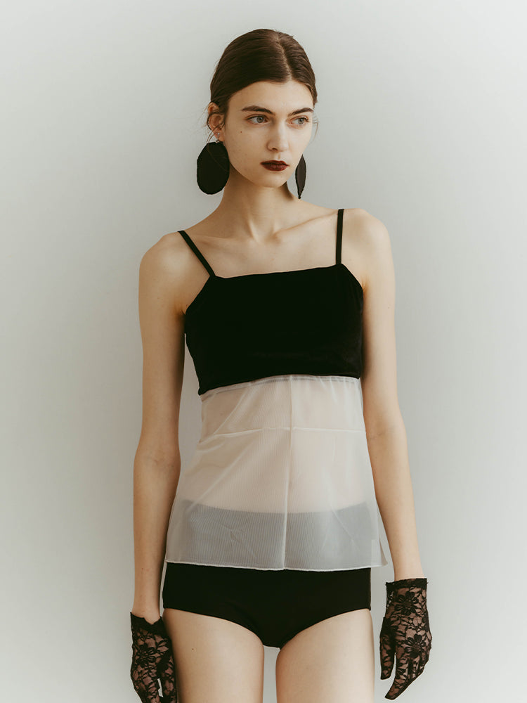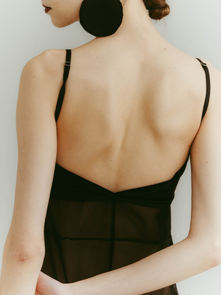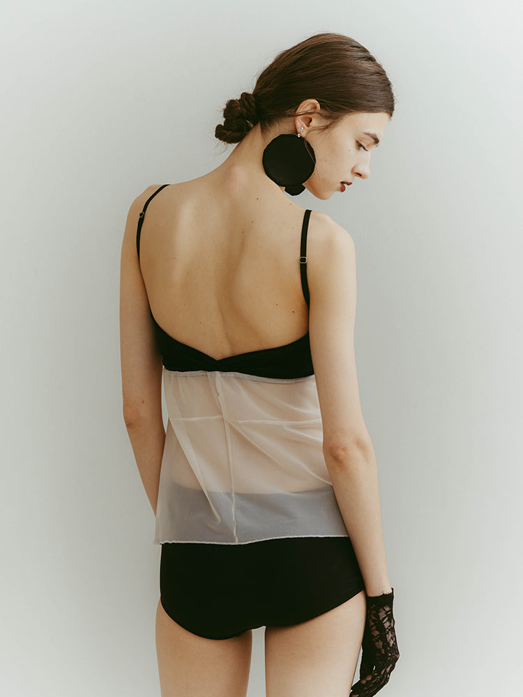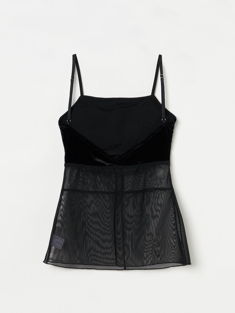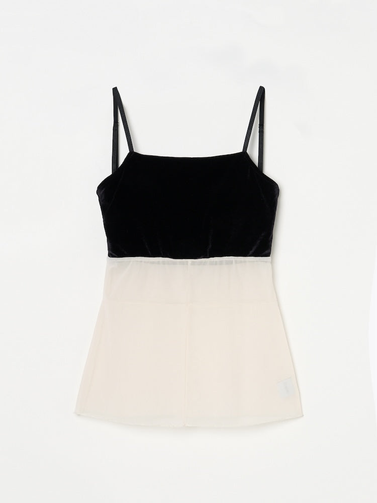 シアーとベロア、質感の異なる素材が静かに重なり合うバックオープンキャミソール。