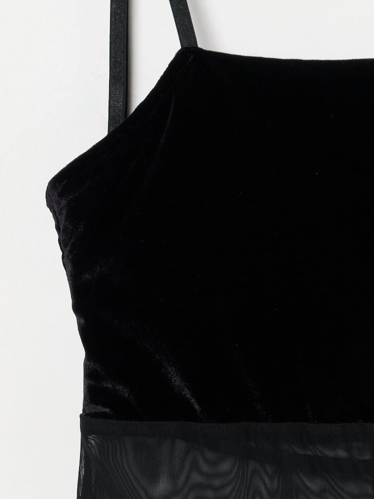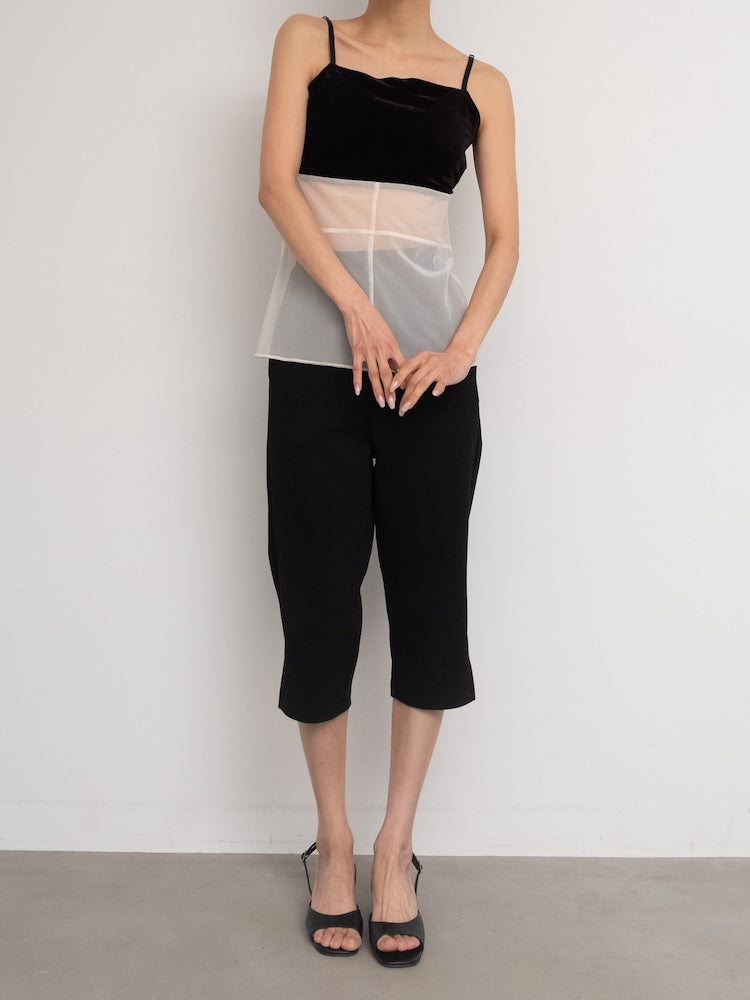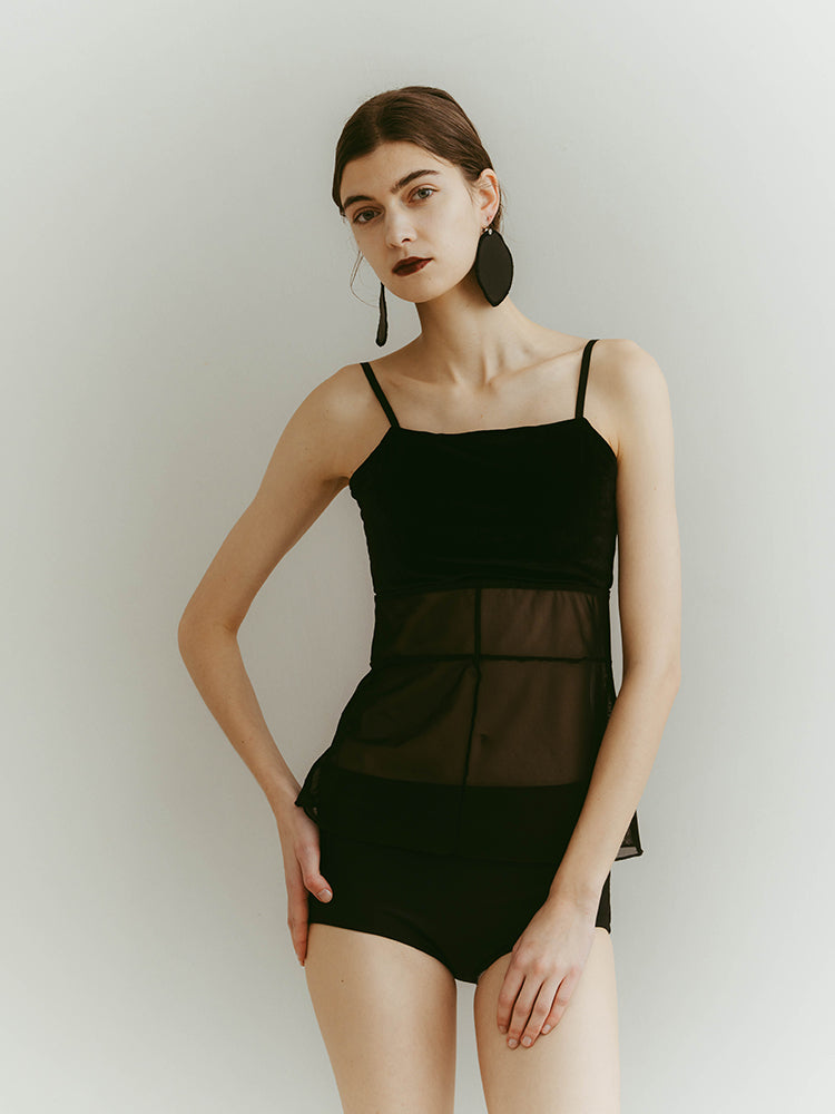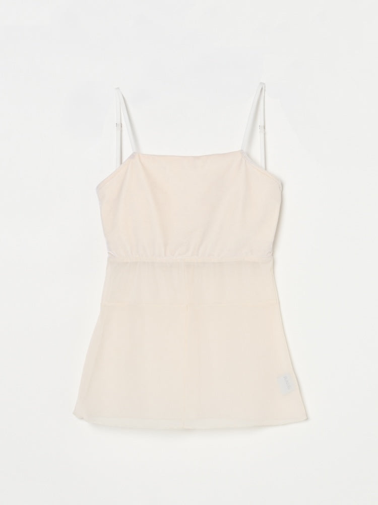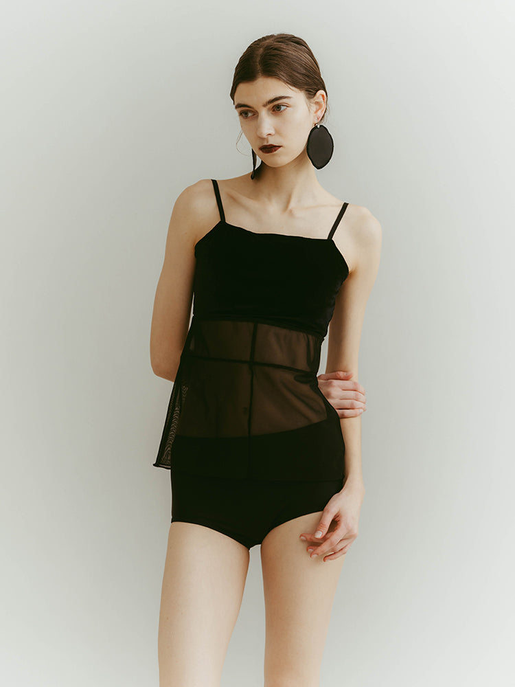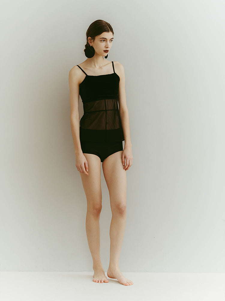 シアーとベロア、質感の異なる素材が静かに重なり合うバックオープンキャミソール。