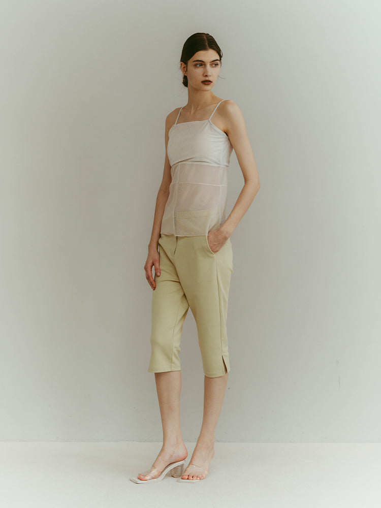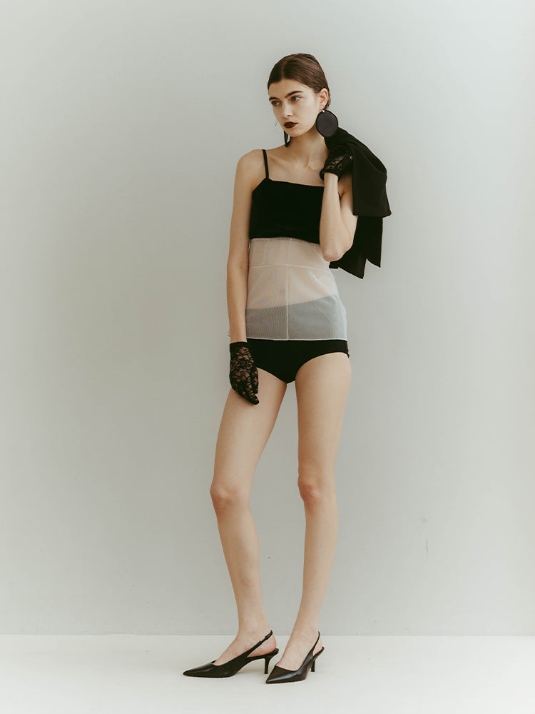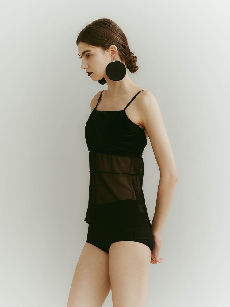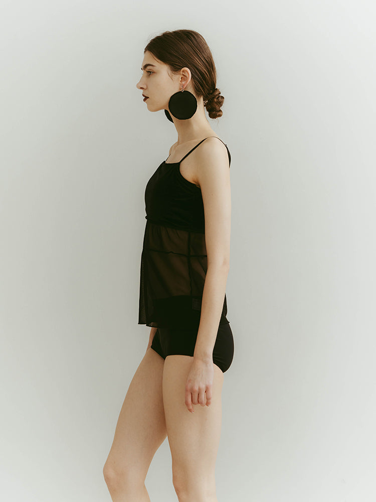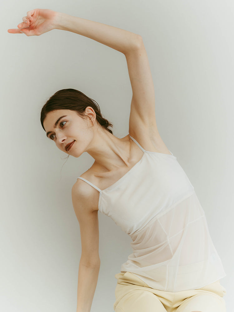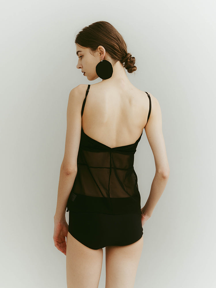 シアーとベロア、質感の異なる素材が静かに重なり合うバックオープンキャミソール。