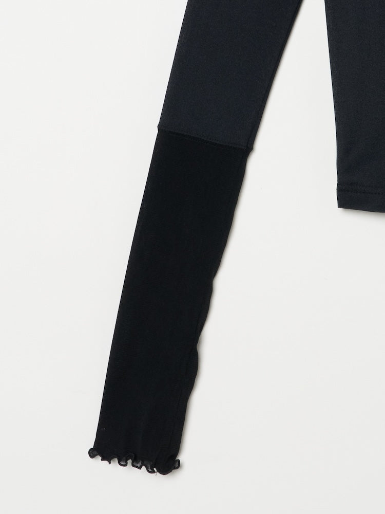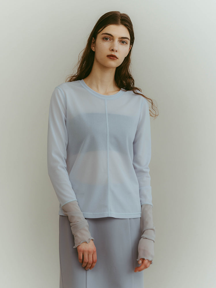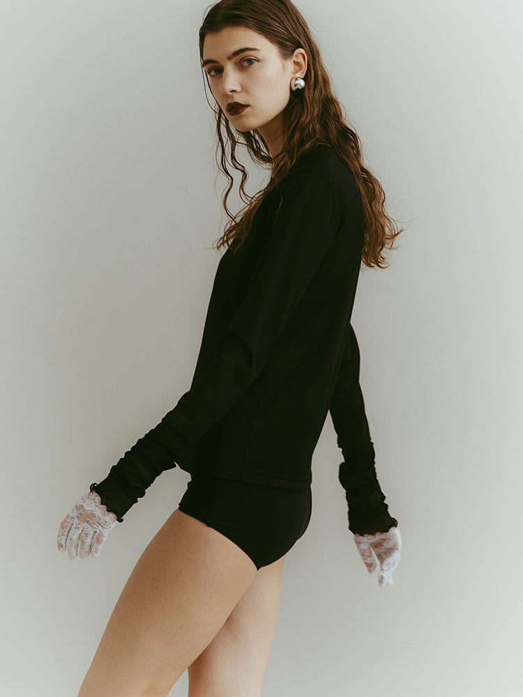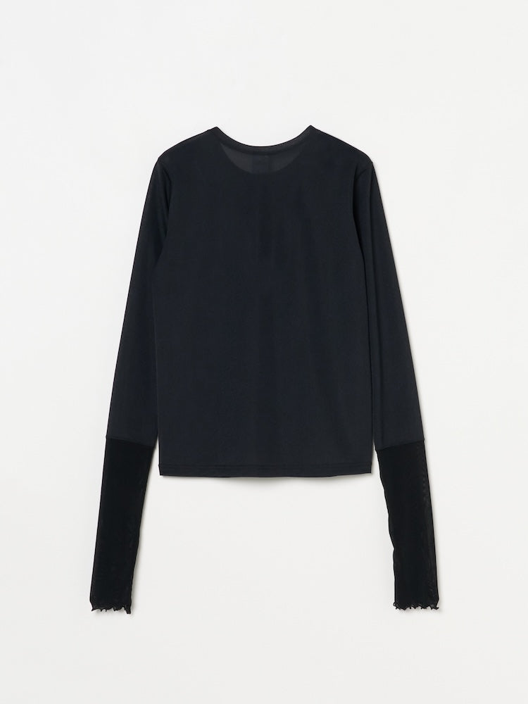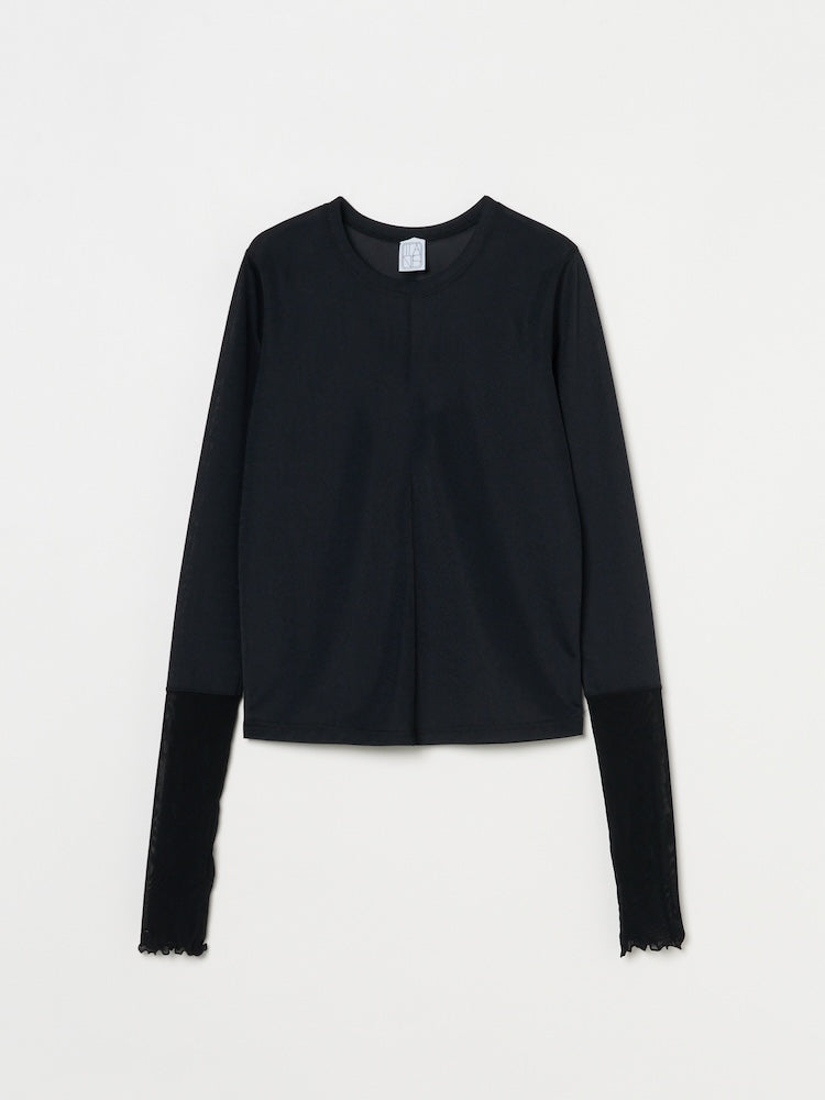 アームの切り替えが個性的な一着。国産トリコット素材を使用しており、ハリ感と肌離れの良さが魅力です。袖先のソフトチュールが柔らかさをプラスし、サムホール付きなのでレイヤードにも重宝します。ほどよい透け感なのでデザインの効いたインナーを仕込んで透けさせるスタイリングがおすすめ。