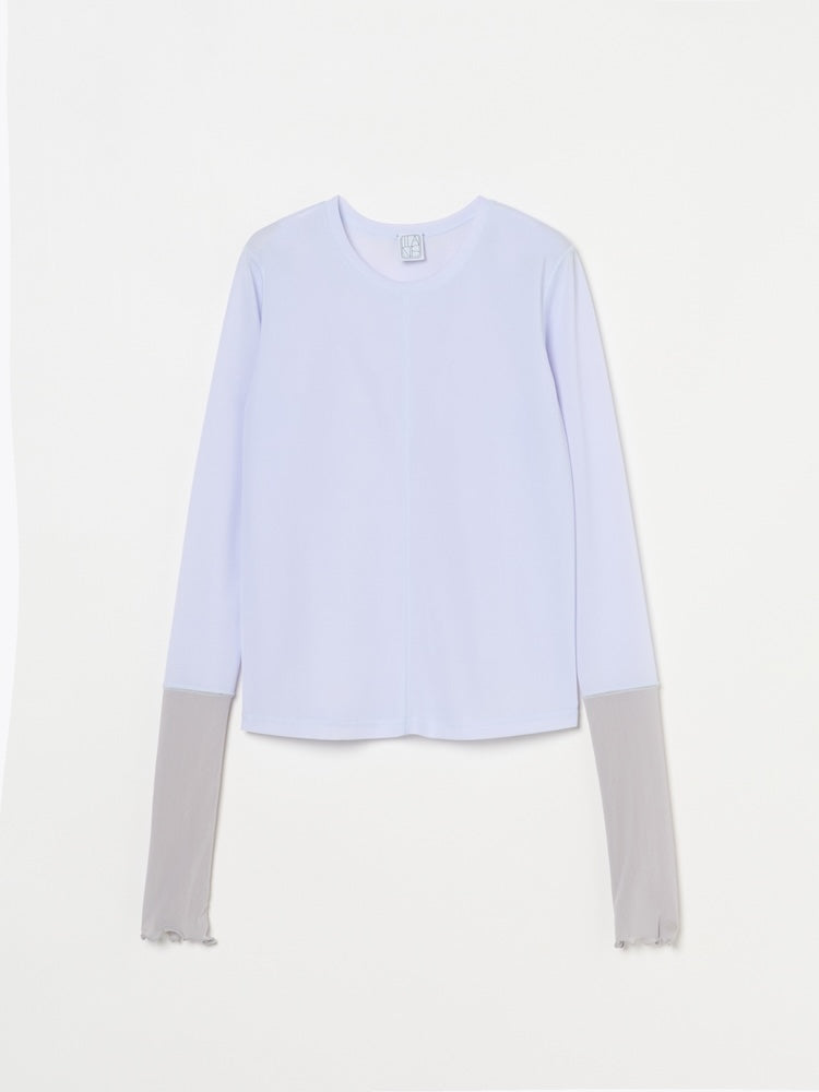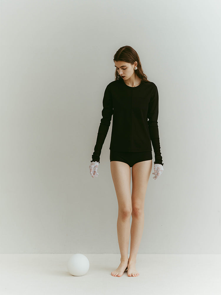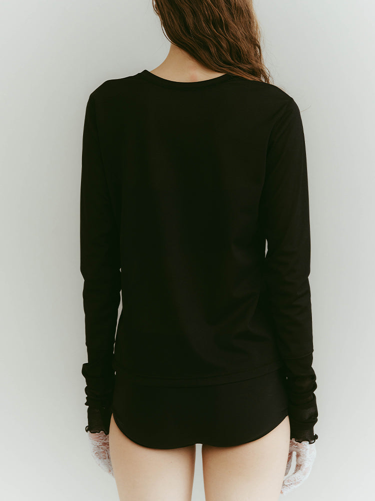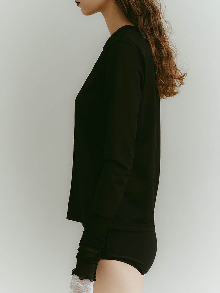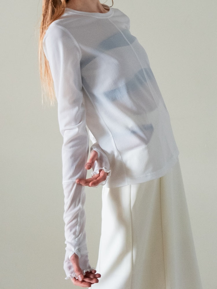 アームの切り替えが個性的な一着。国産トリコット素材を使用しており、ハリ感と肌離れの良さが魅力です。袖先のソフトチュールが柔らかさをプラスし、サムホール付きなのでレイヤードにも重宝します。ほどよい透け感なのでデザインの効いたインナーを仕込んで透けさせるスタイリングがおすすめ。
