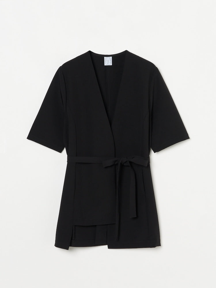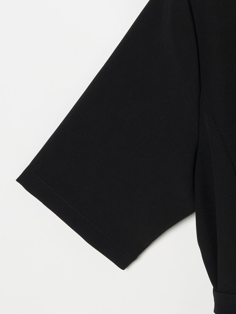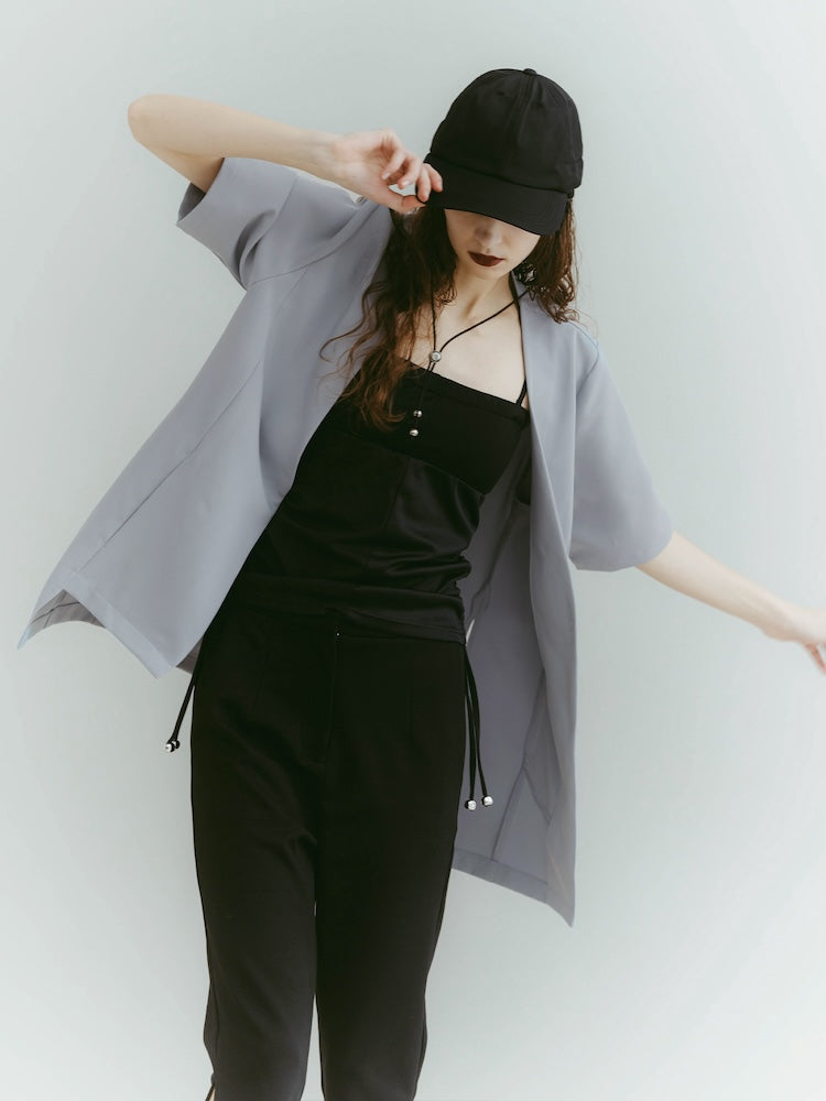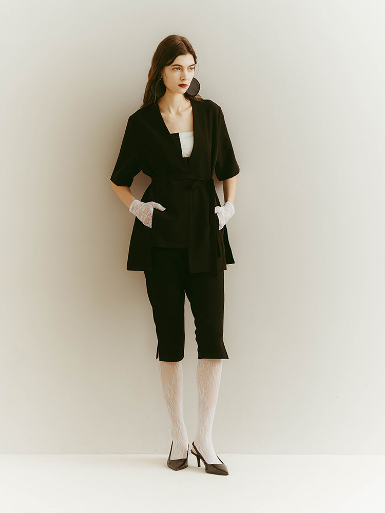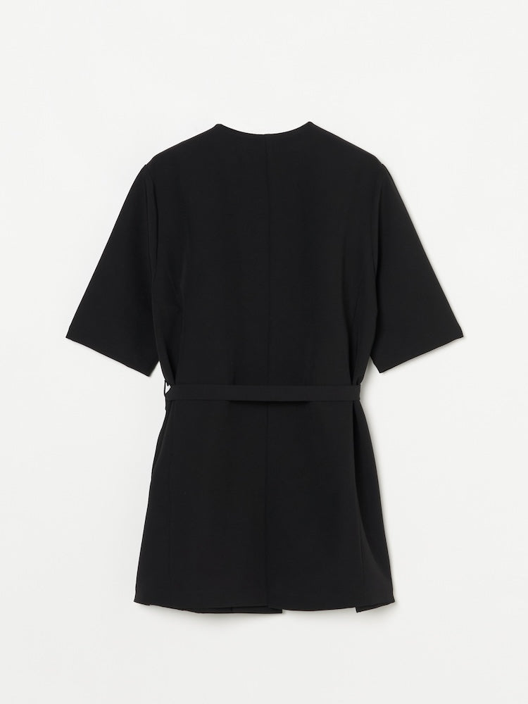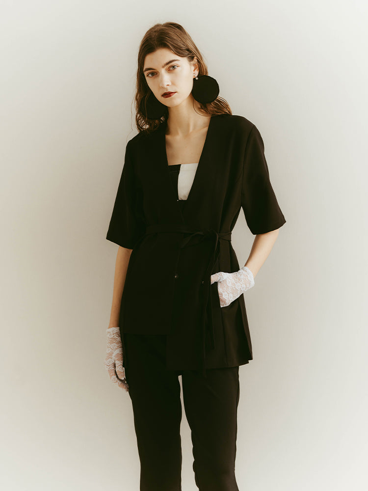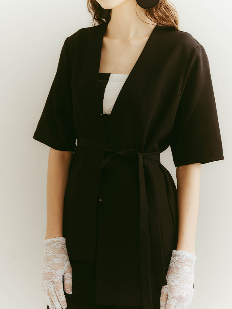 軽やかなジョーゼット素材の半袖ジャケット。オーバーサイズながら、付属のベルトでシルエットの調整が可能です。アシンメトリーなディテールが光る一着で、同素材のスカートとのセットアップもおすすめです。