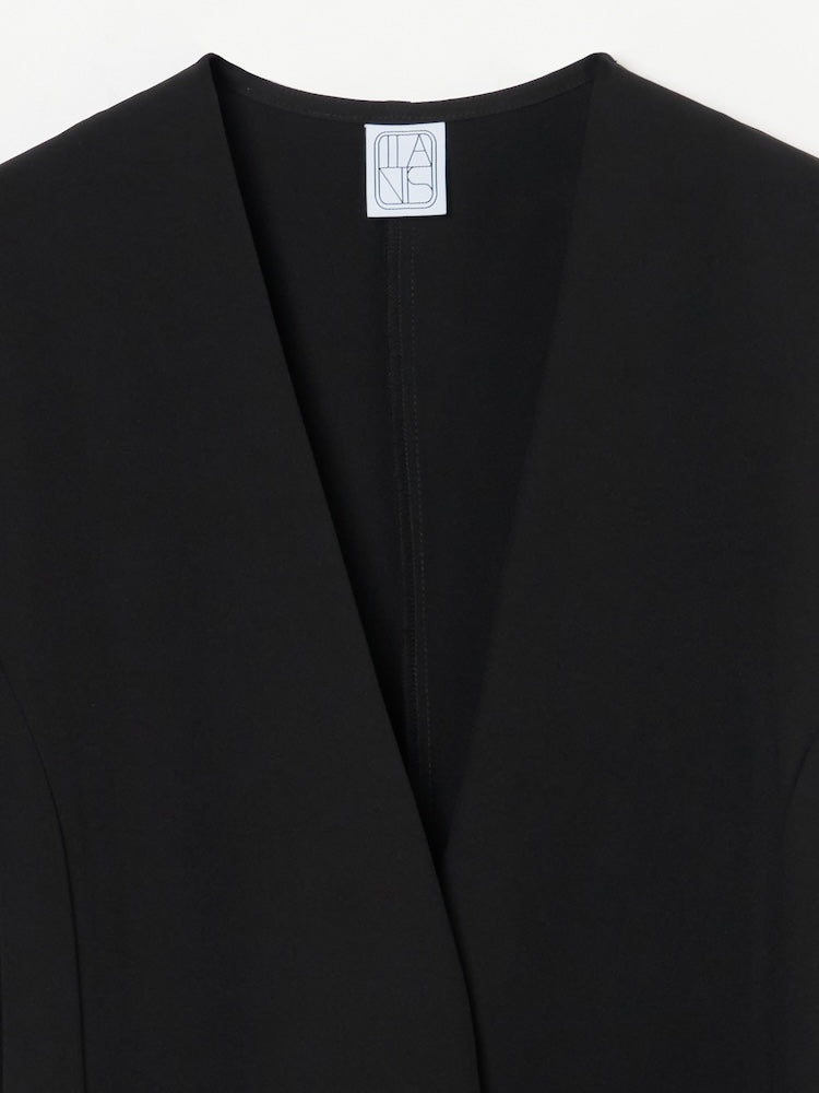顔まわりをすっきりと魅せてくれるノーカラー、裾のアシンメトリーデザイン、そして気になる二の腕や腰回りをカバーしてくれるサイズ感。上品な質感なので女性らしく着られます。