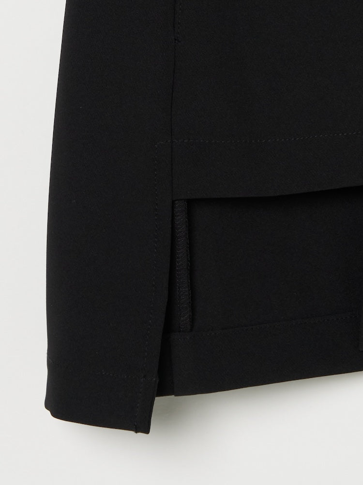 シンプルな佇まいながらも裾のアシンメトリーカットとウエストベルトの調整によって表情の変化を楽しめるデザインに。