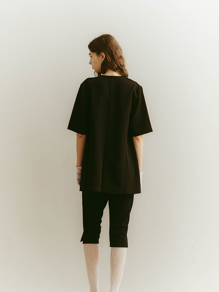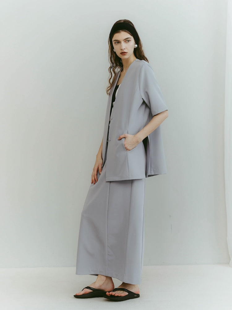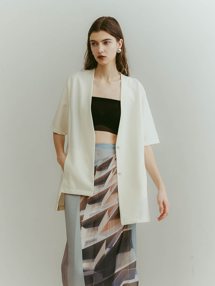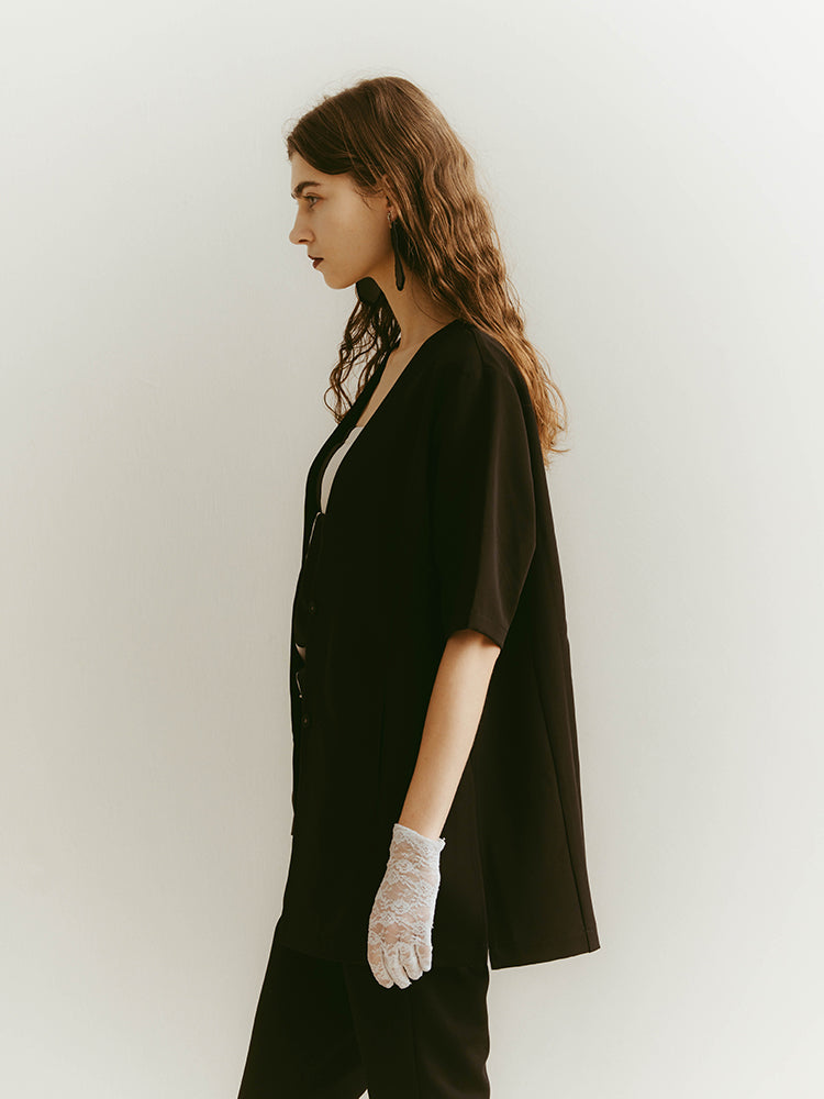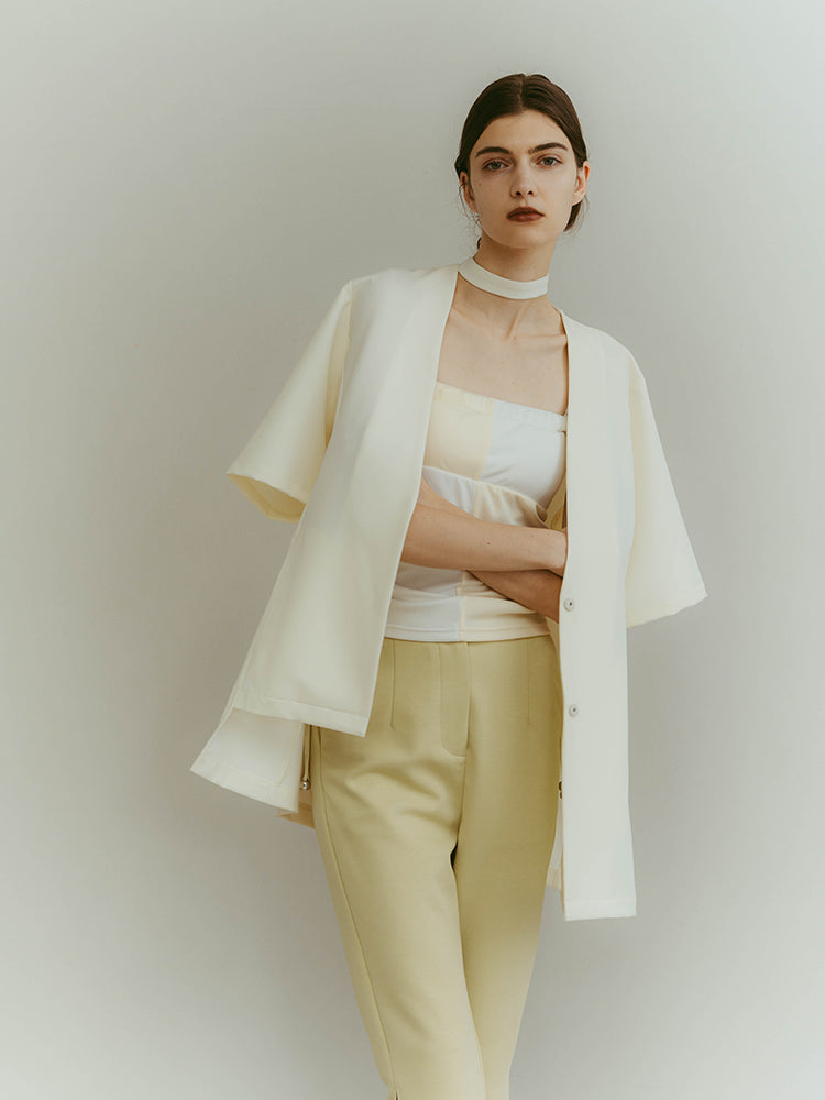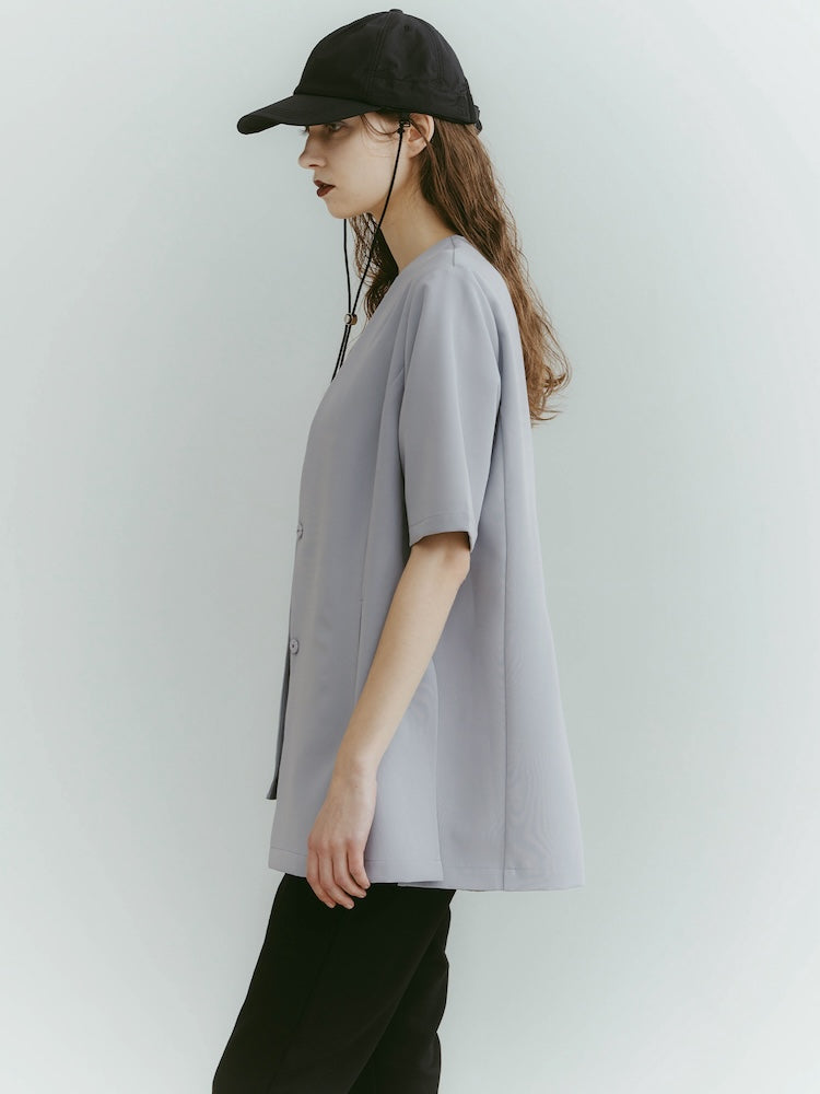 自然体でいられる着心地よさを大切に仕立てたハーフスリーブのノーカラージャケット。