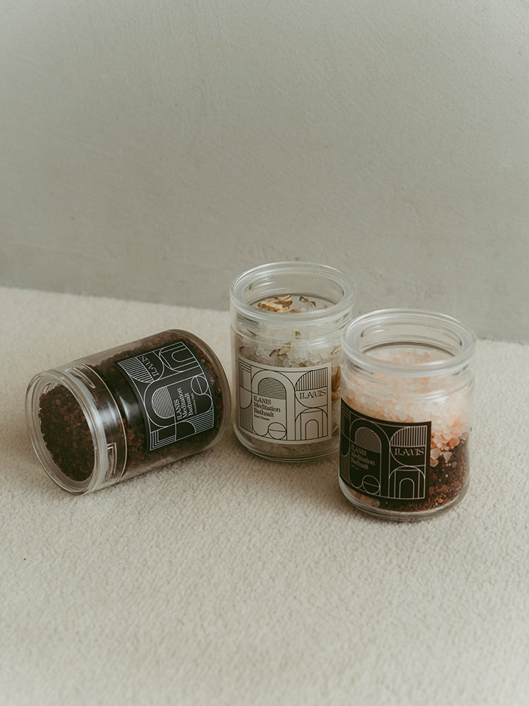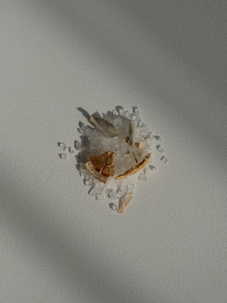 澄んだ白い岩塩に、ドライレモンとセージをブレンド。ミントとセージの清涼感あふれる香りが、心身を軽やかにクリアリングします。重たくなった感覚を解放し、静かに整うリセットの時間に。