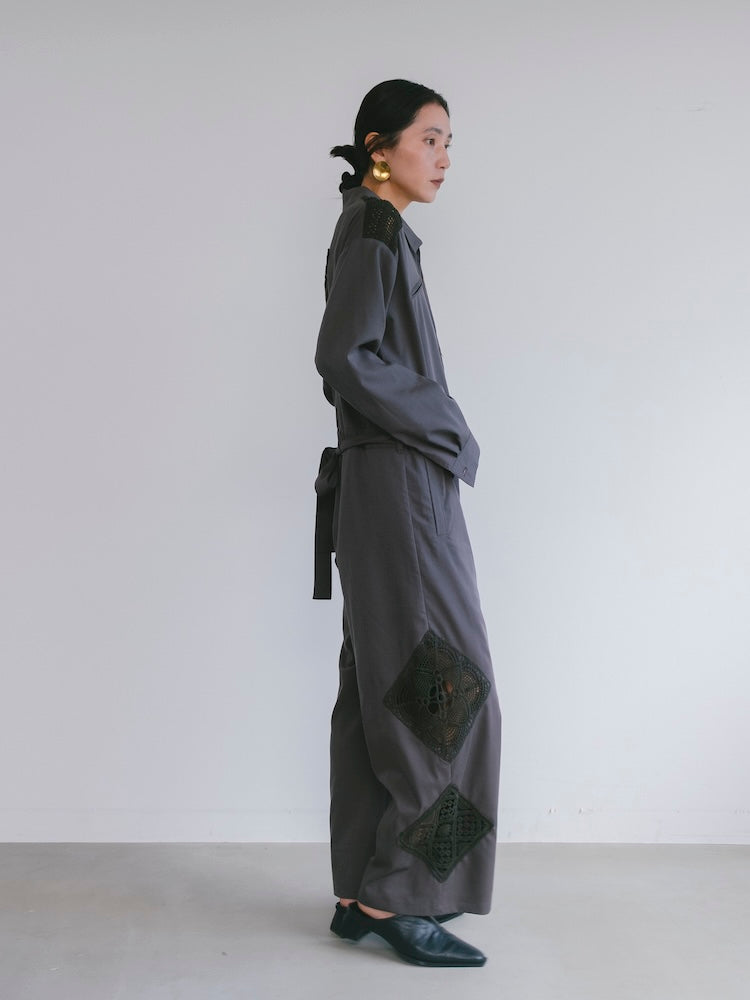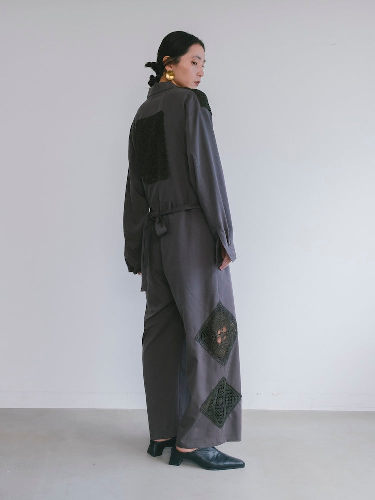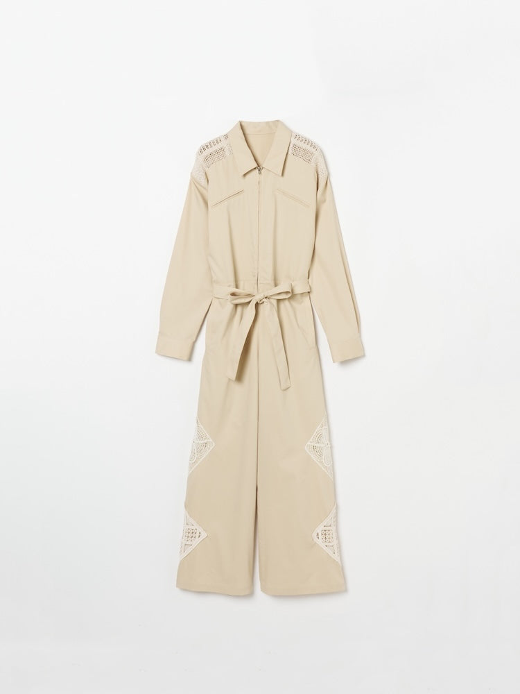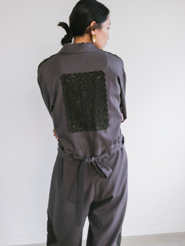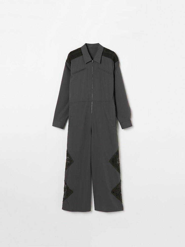 植物や太陽を想起させる模様の4種のレースを切り替え、ヴィンテージライクなムードの中に品のある佇まいを宿したオールインワン。