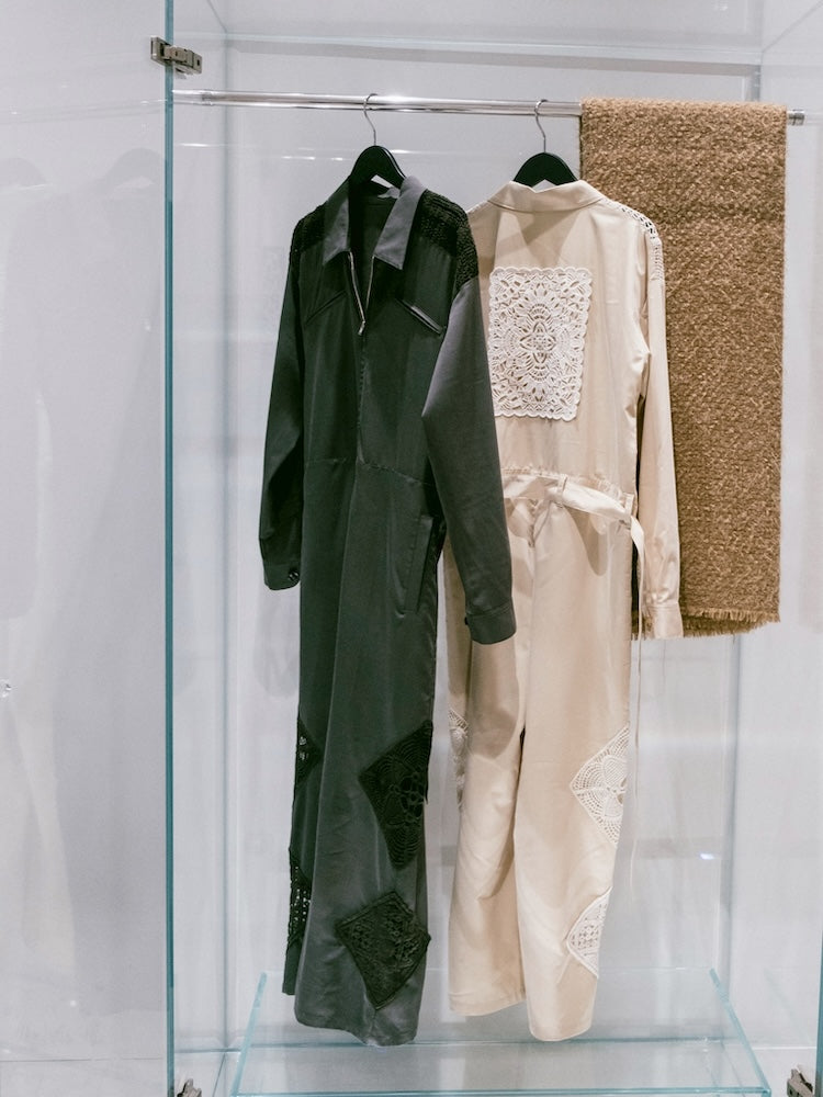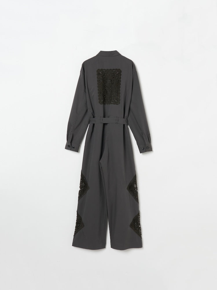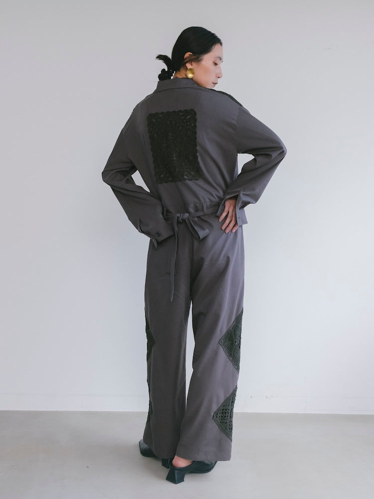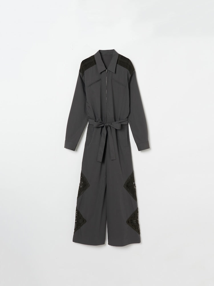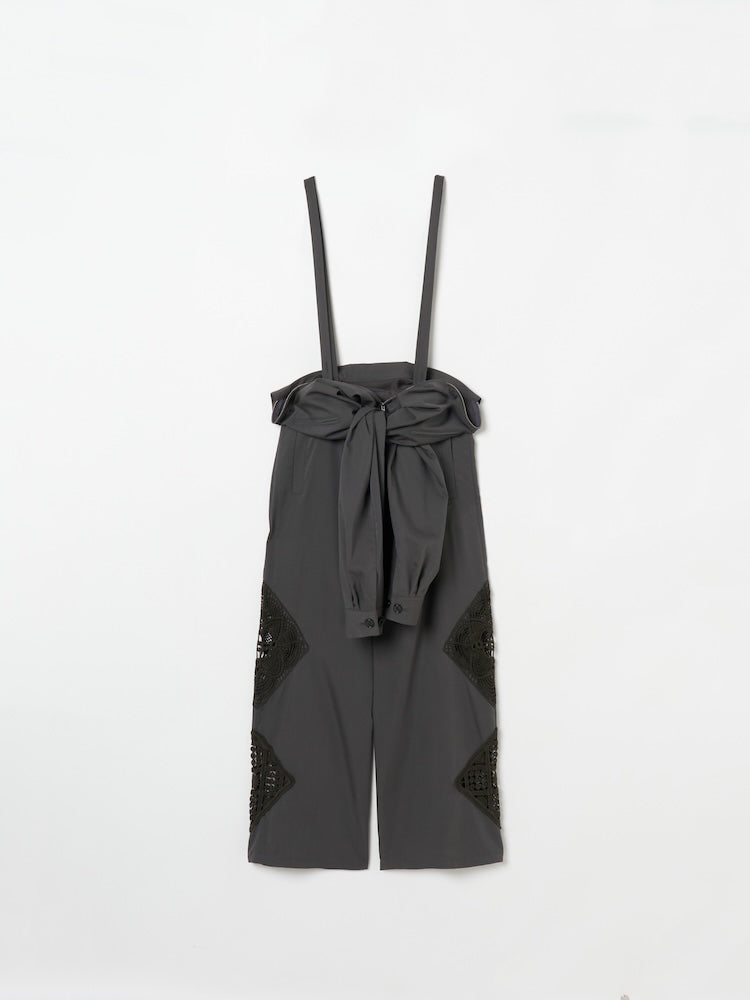 植物や太陽を想起させる模様の4種のレースを切り替え、ヴィンテージライクなムードの中に品のある佇まいを宿したオールインワン。
