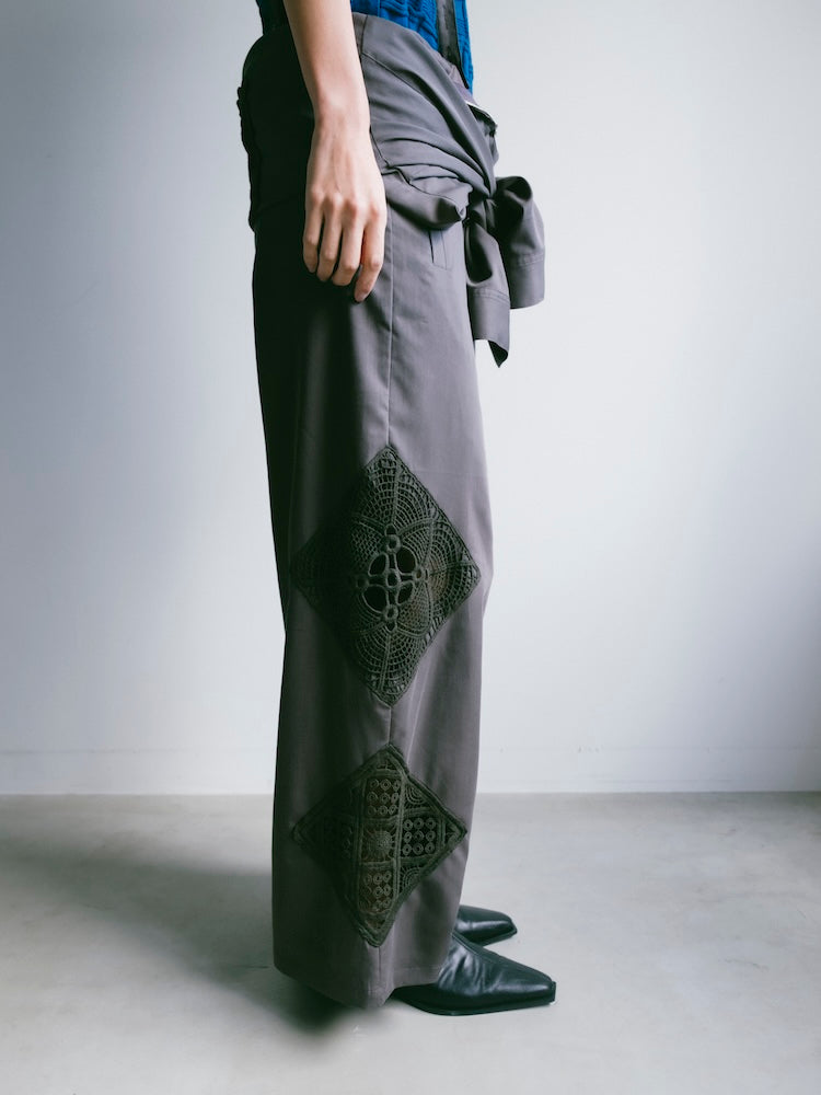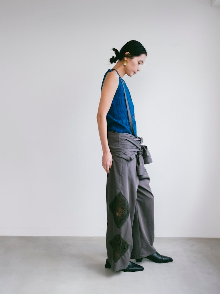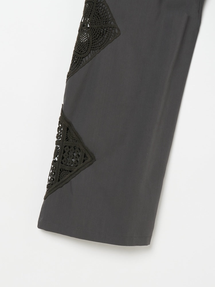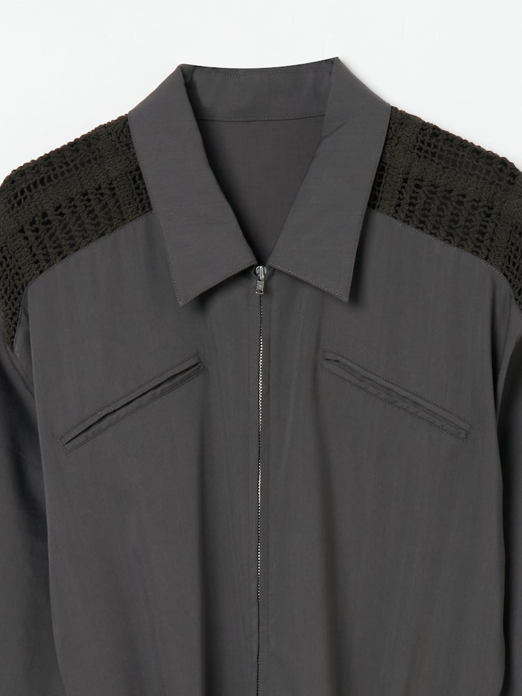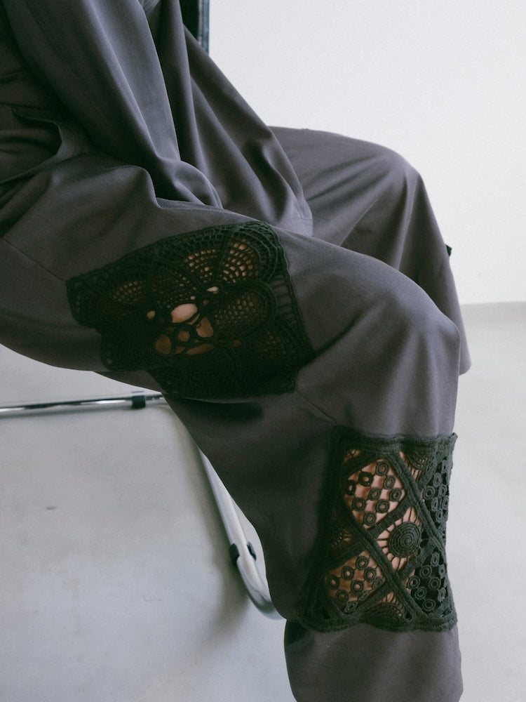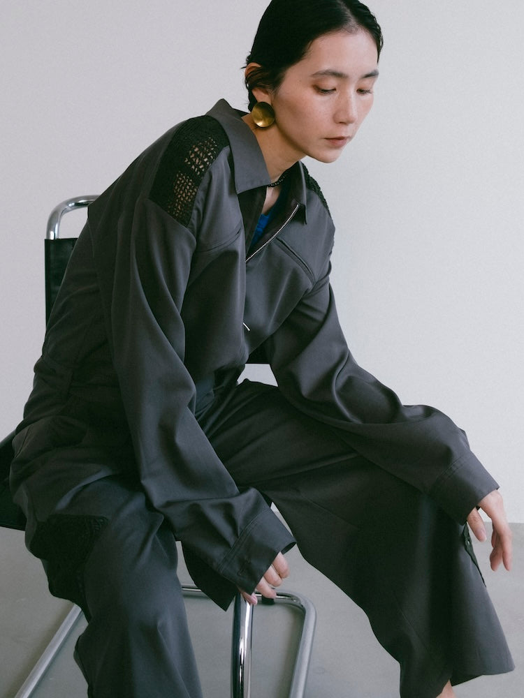 肩・背中・サイドに配した異なるレースが、端正なフォルムにリズムと遊びを添え、ワークに寄りすぎない絶妙なバランスを生み出します。
