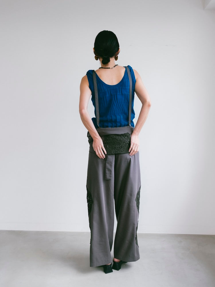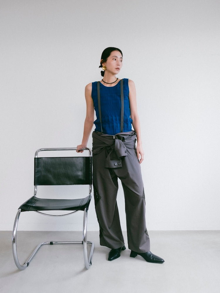 パンツスタイル時には、内側の両サイドに内蔵した取り外し可能な肩紐がサスペンダーとして機能します。