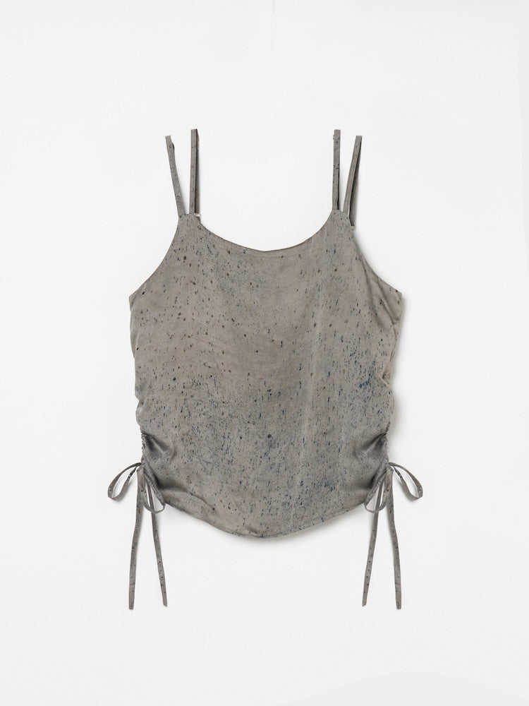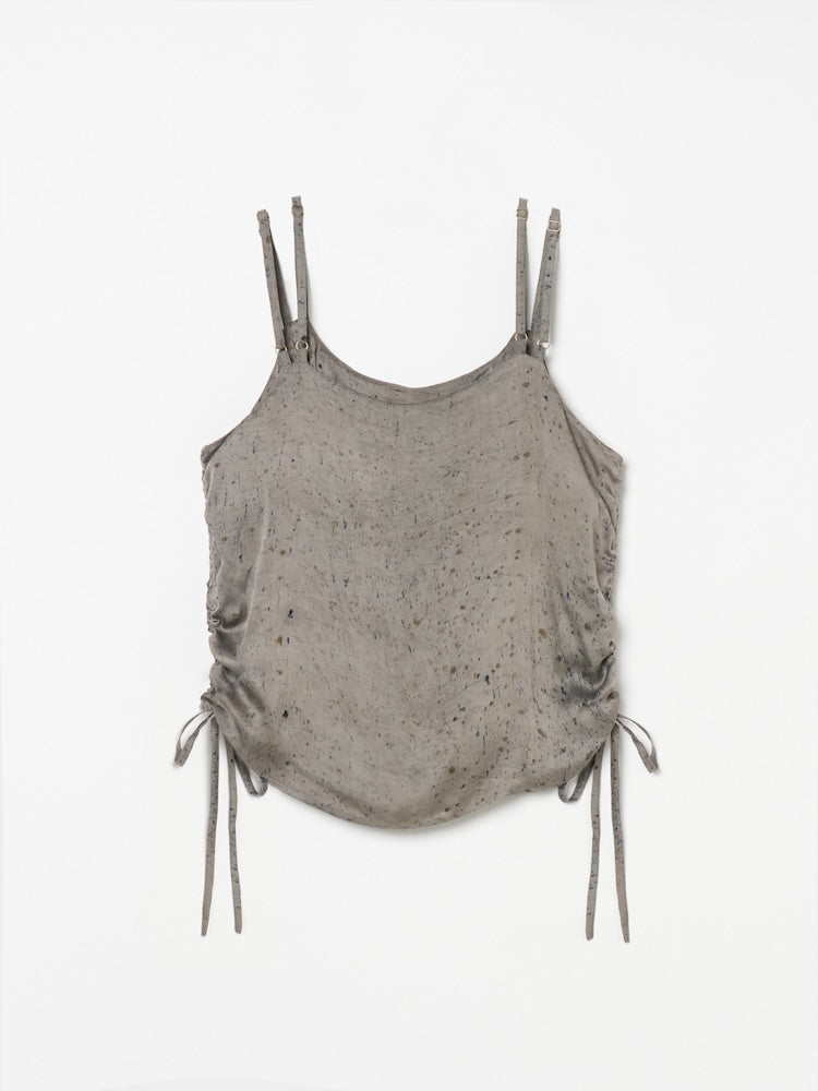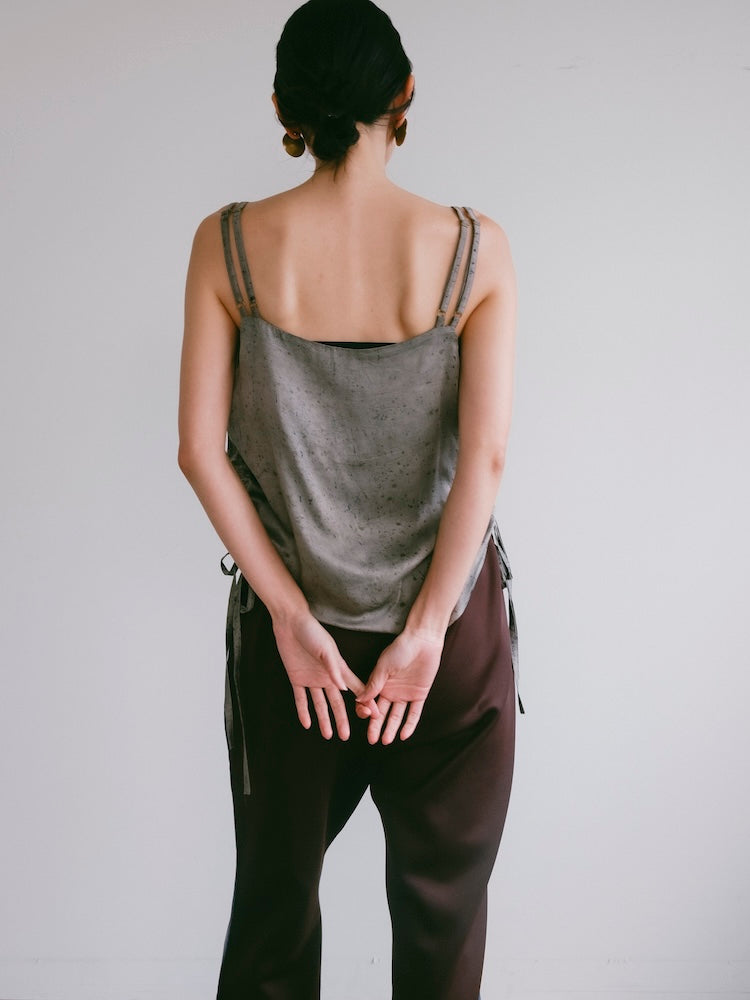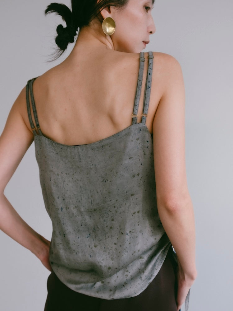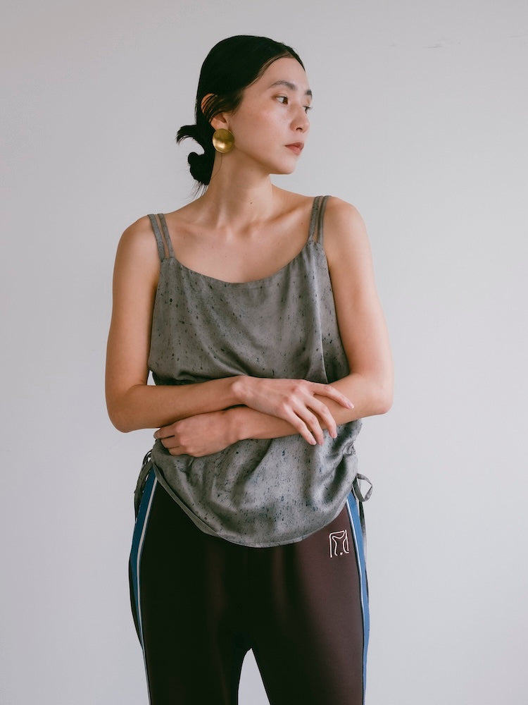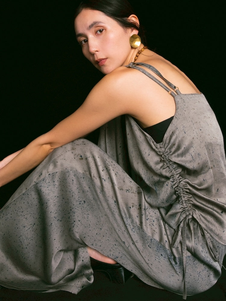 ヴィーガンシルクならではのとろみと、美しく流れる落ち感が魅力のギャザーキャミソール。