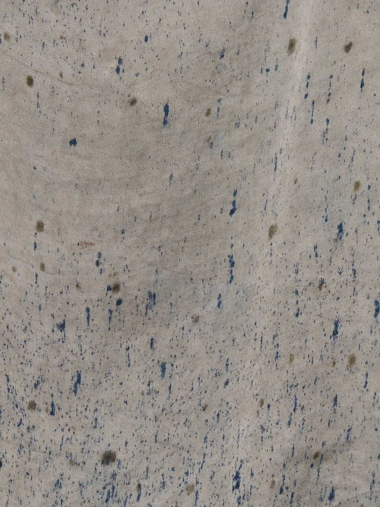 インドにて、滑らかな光沢をもつヴィーガンシルク生地の上に樹皮・果皮・根・発酵素材といった染料植物を配置し、棒状に巻き付けて蒸し上げることで植物がもつ色素や輪郭をそのまま布へと写しとる染色技法"バンドルダイ"。一点一点手作業で染色されたオリジナルテキスタイル。