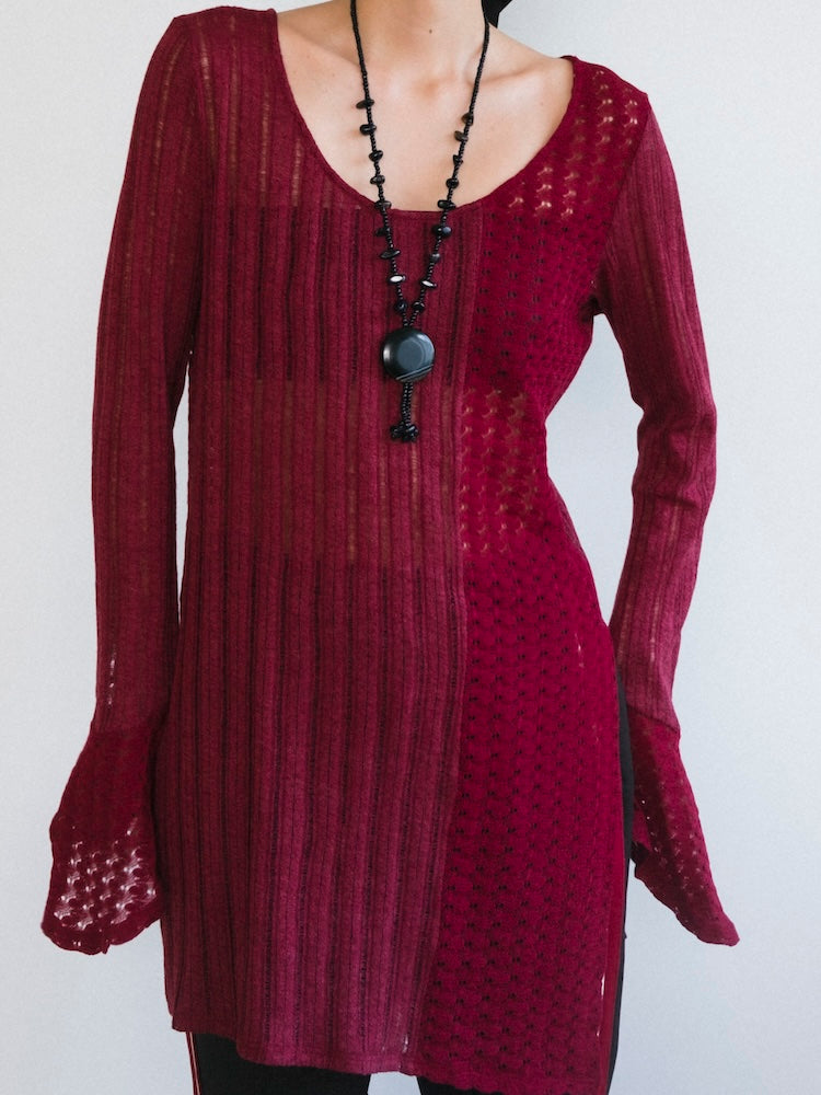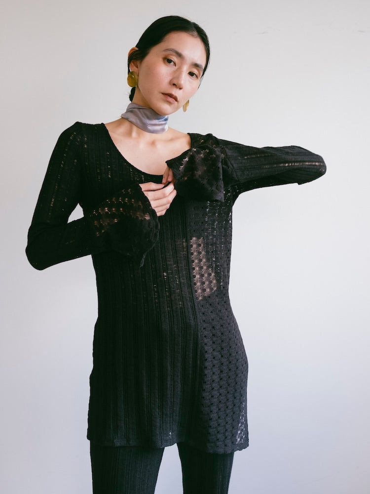 伸縮性のある2種類のレースを切り替えたロングトップ。